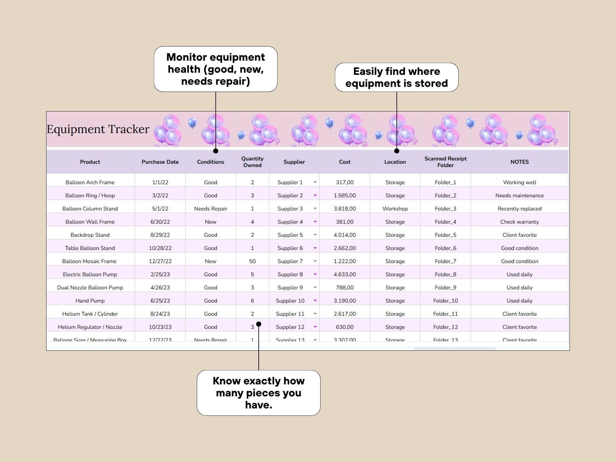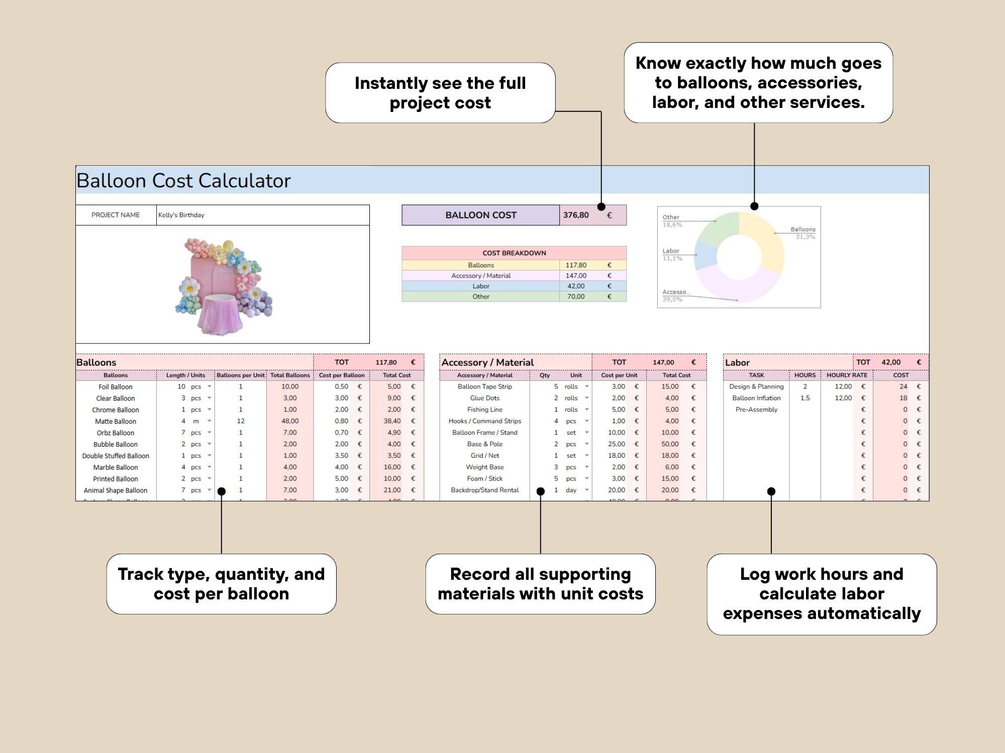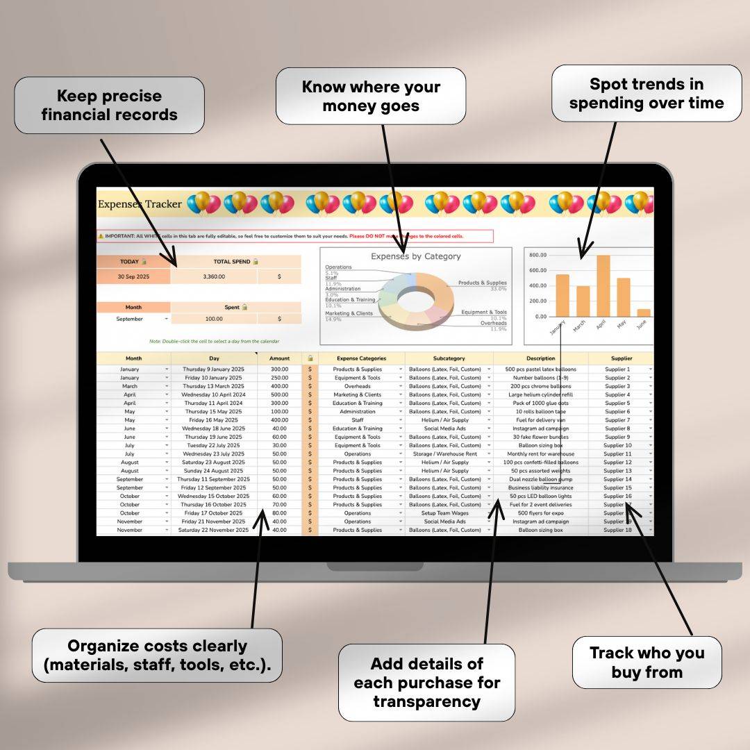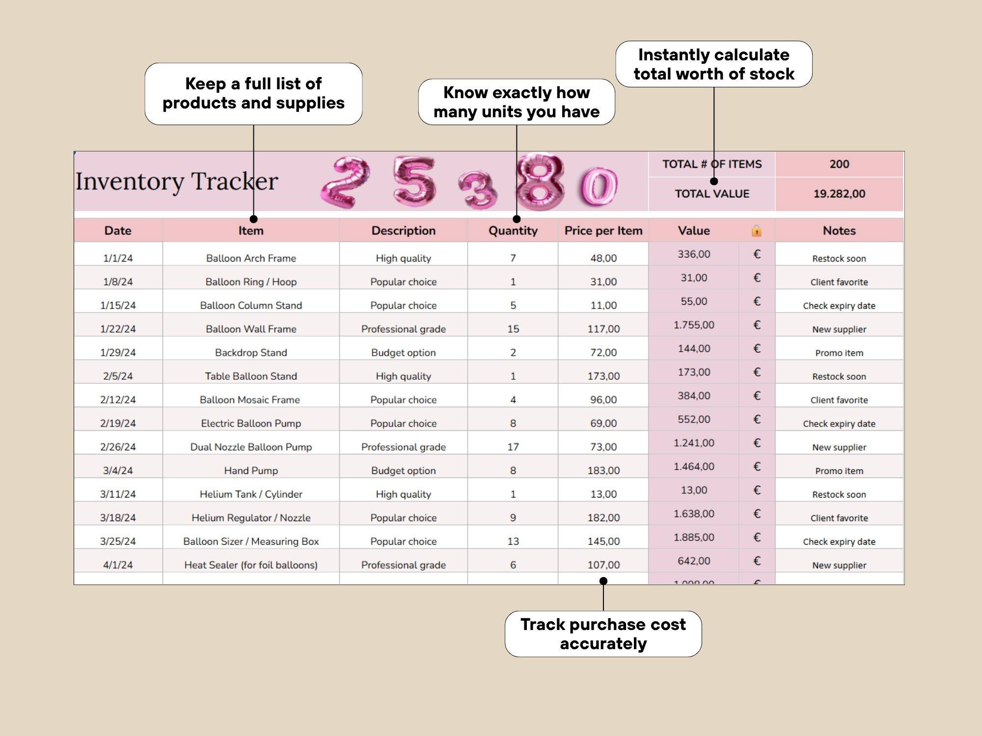 This simple, ready-to-use spreadsheet is every balloon artist’s dream. Just download, open, and start organizing your business right away. Add events, track expenses, update inventory — everything updates automatically, with no complicated setup required.