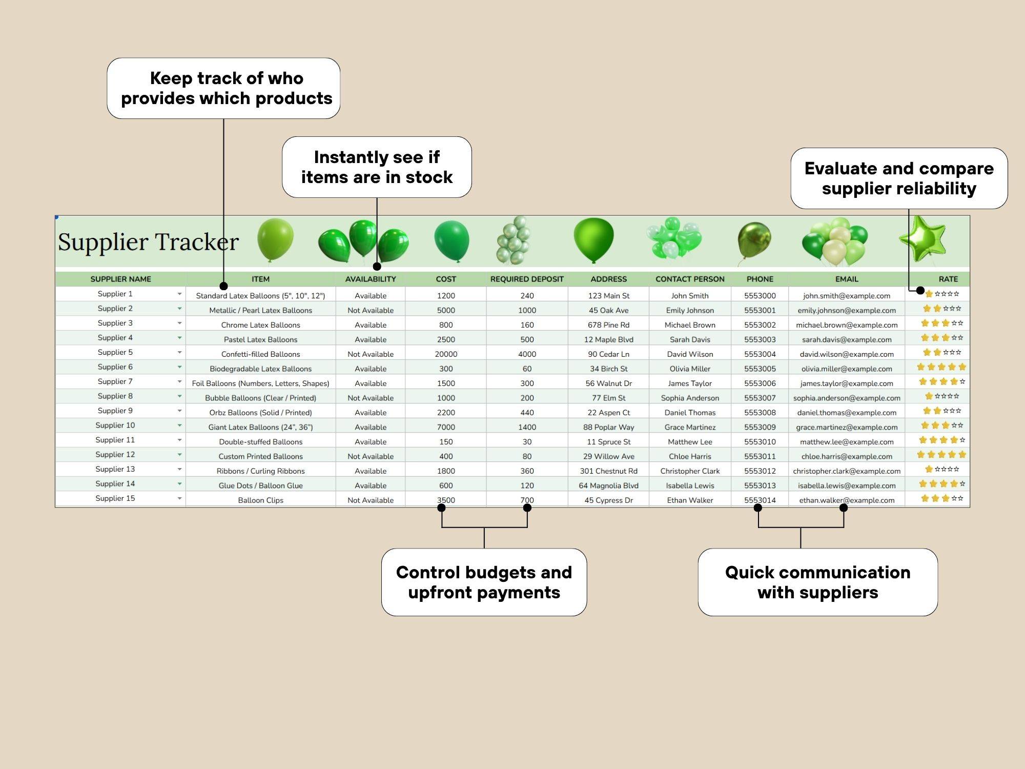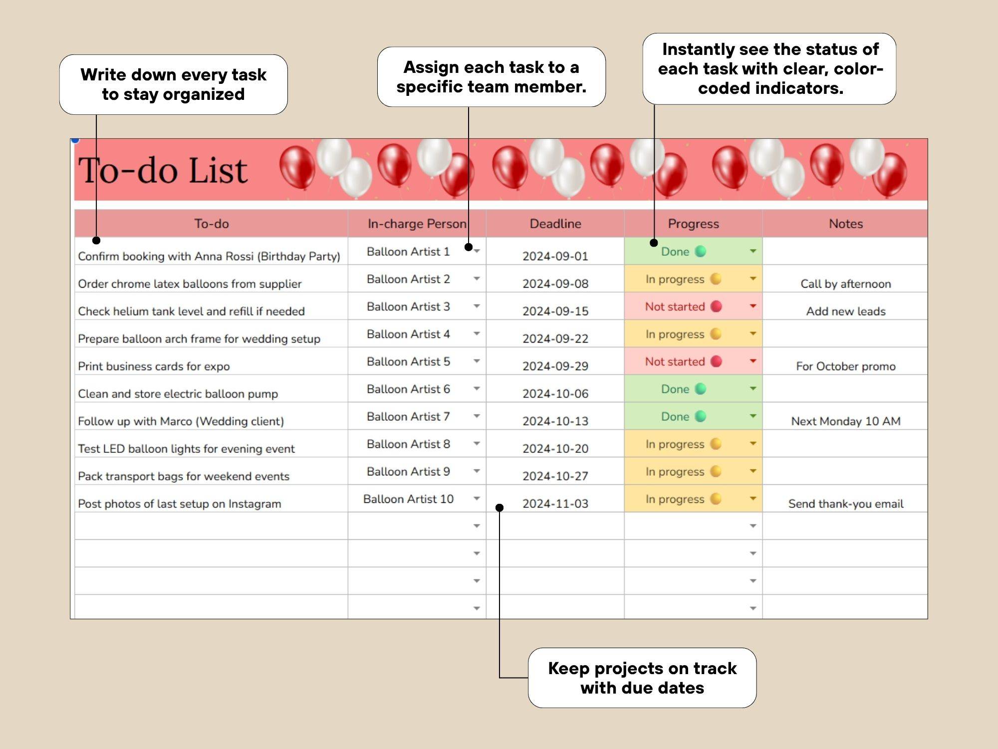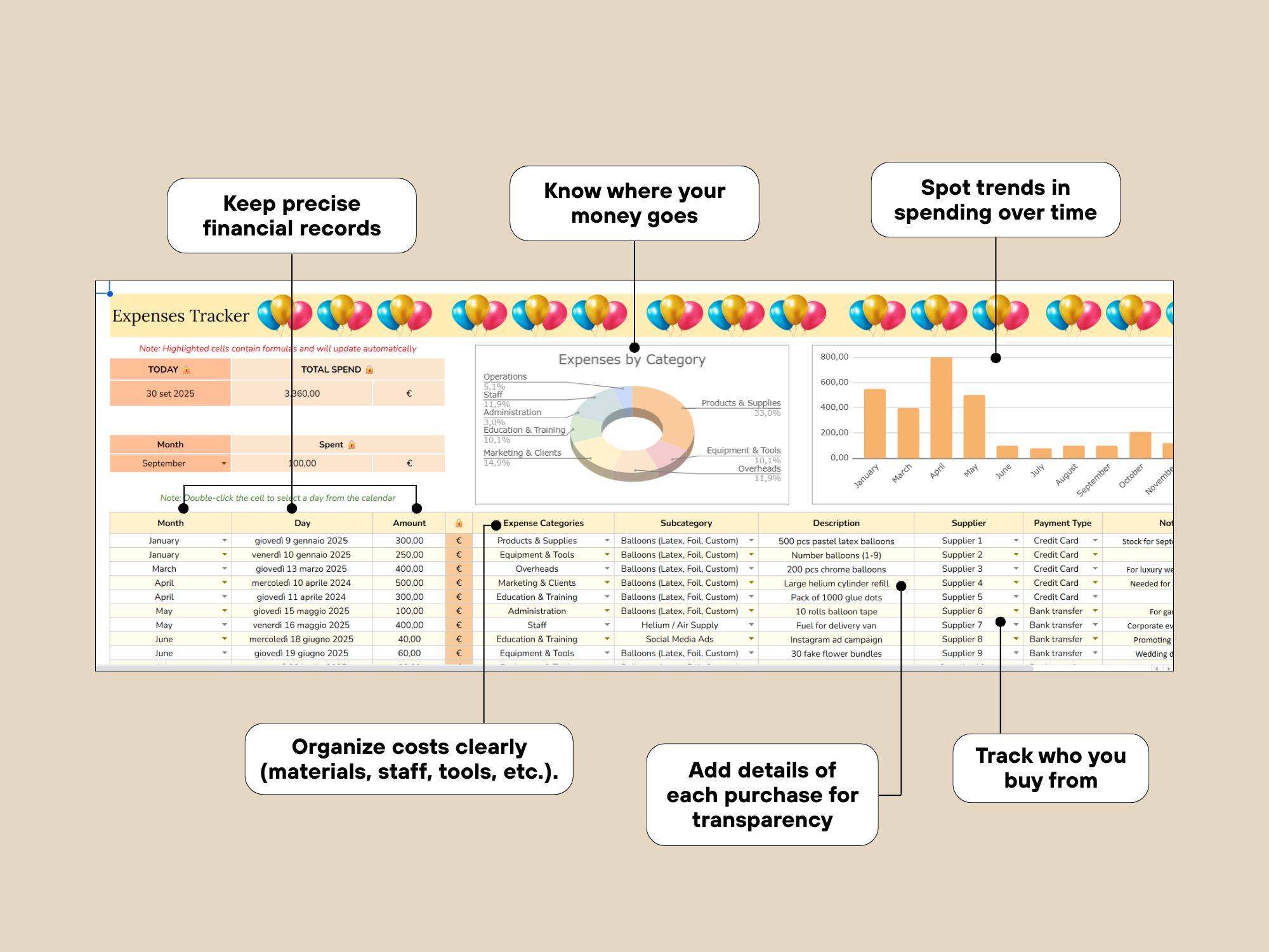 This simple, ready-to-use spreadsheet is every balloon artist’s dream. Just download, open, and start organizing your business right away. Add events, track expenses, update inventory — everything updates automatically, with no complicated setup required.