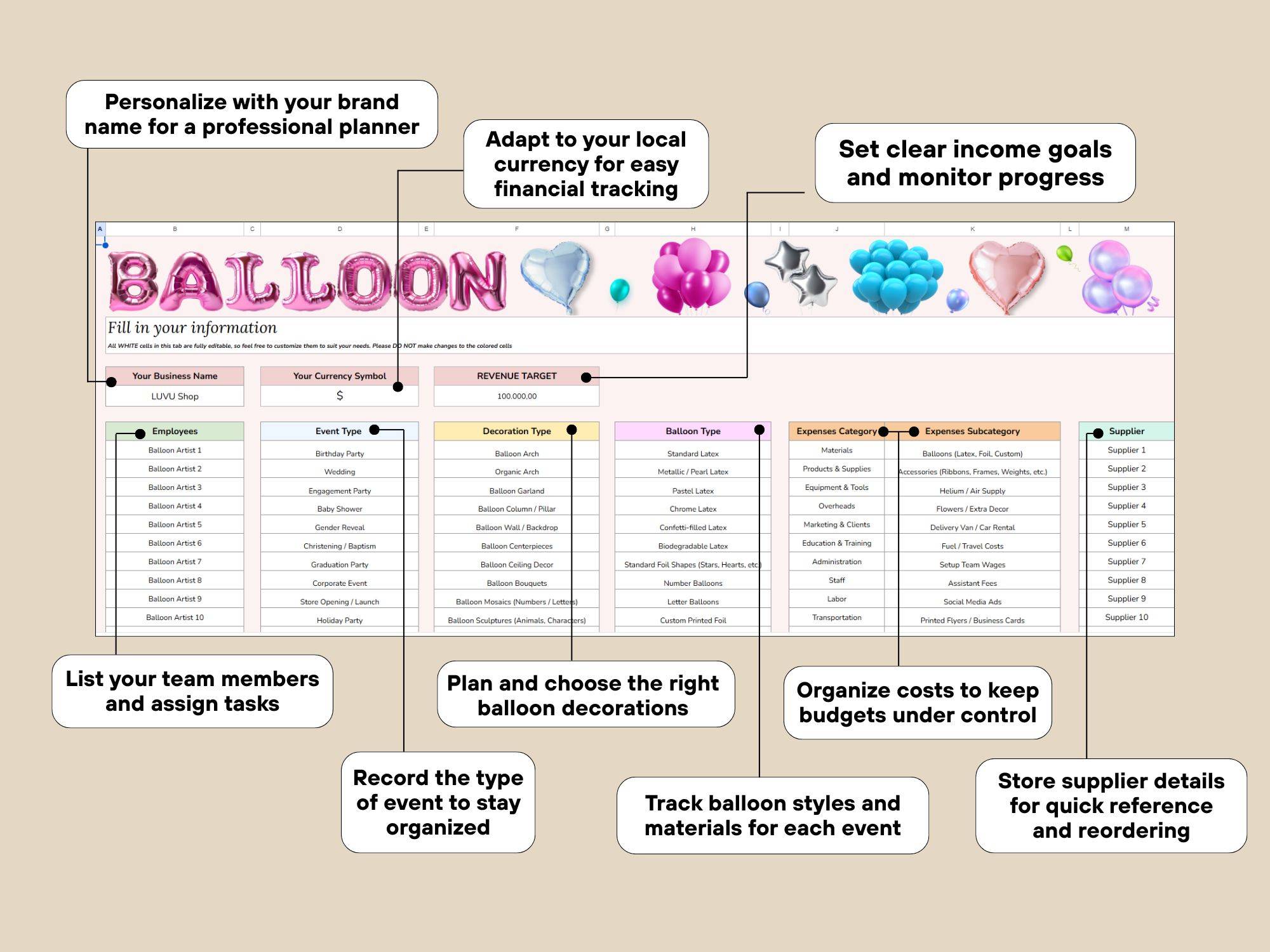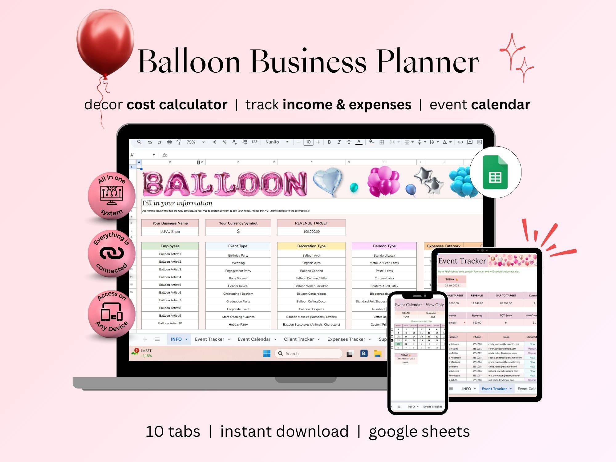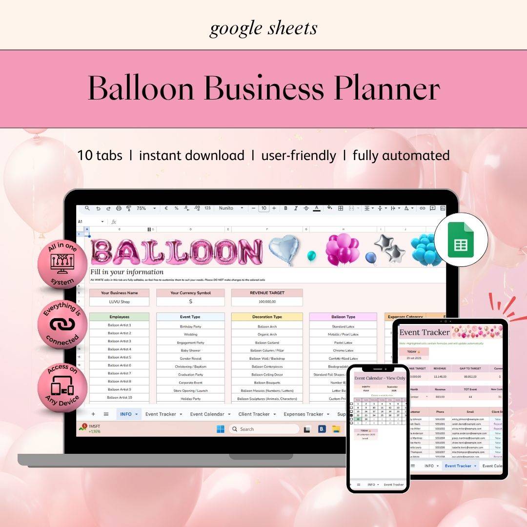 All you need is Google Sheets. Every detail is editable — from events to expenses, clients to inventory — so you can tailor the planner to your balloon business needs.”