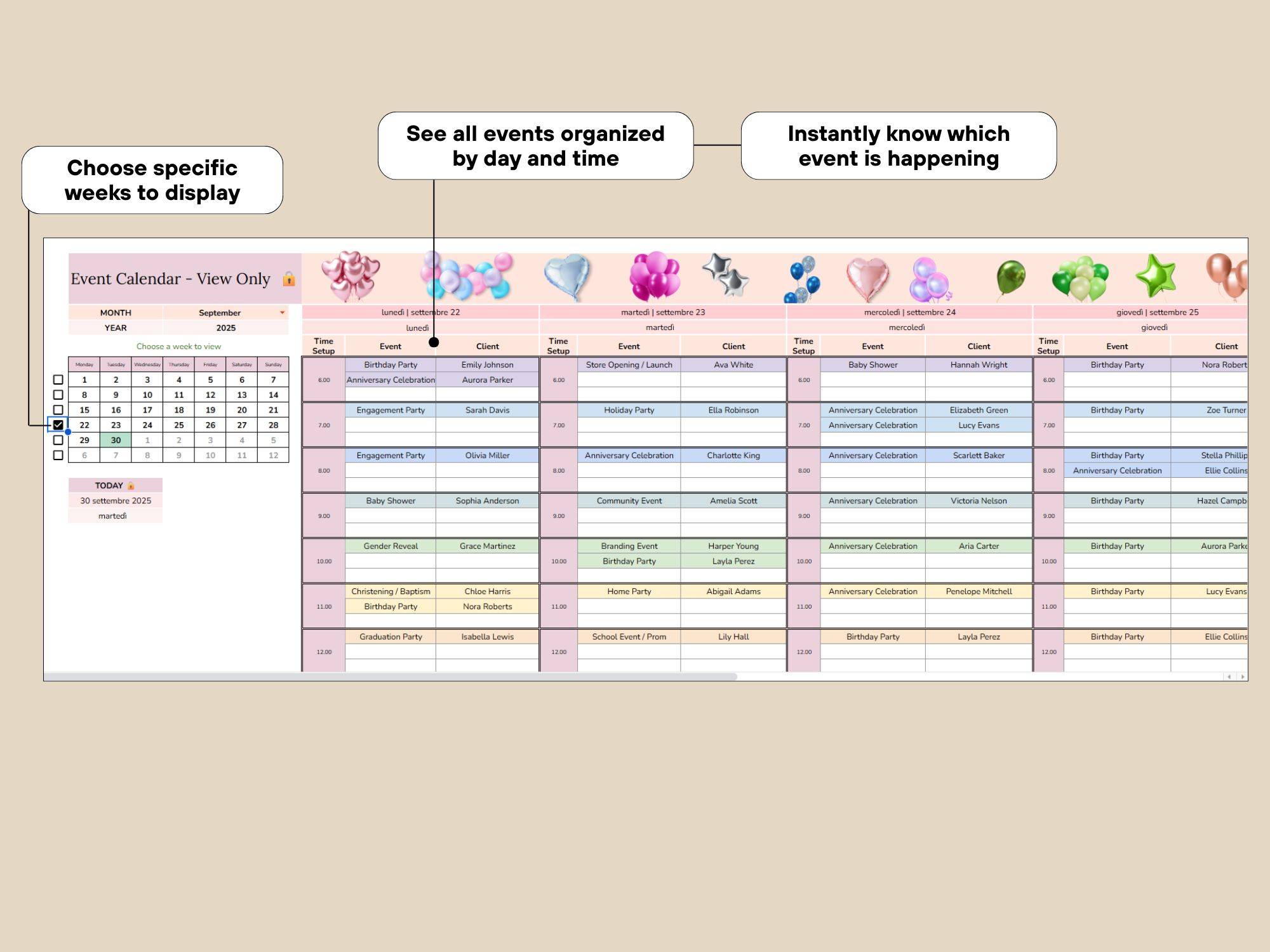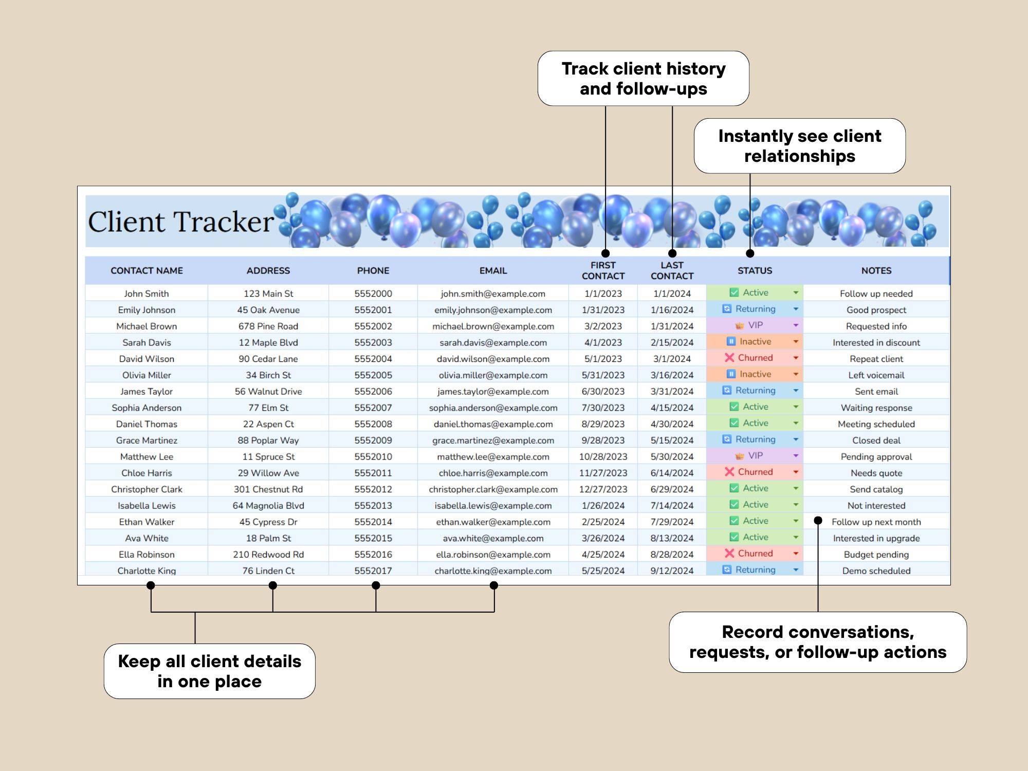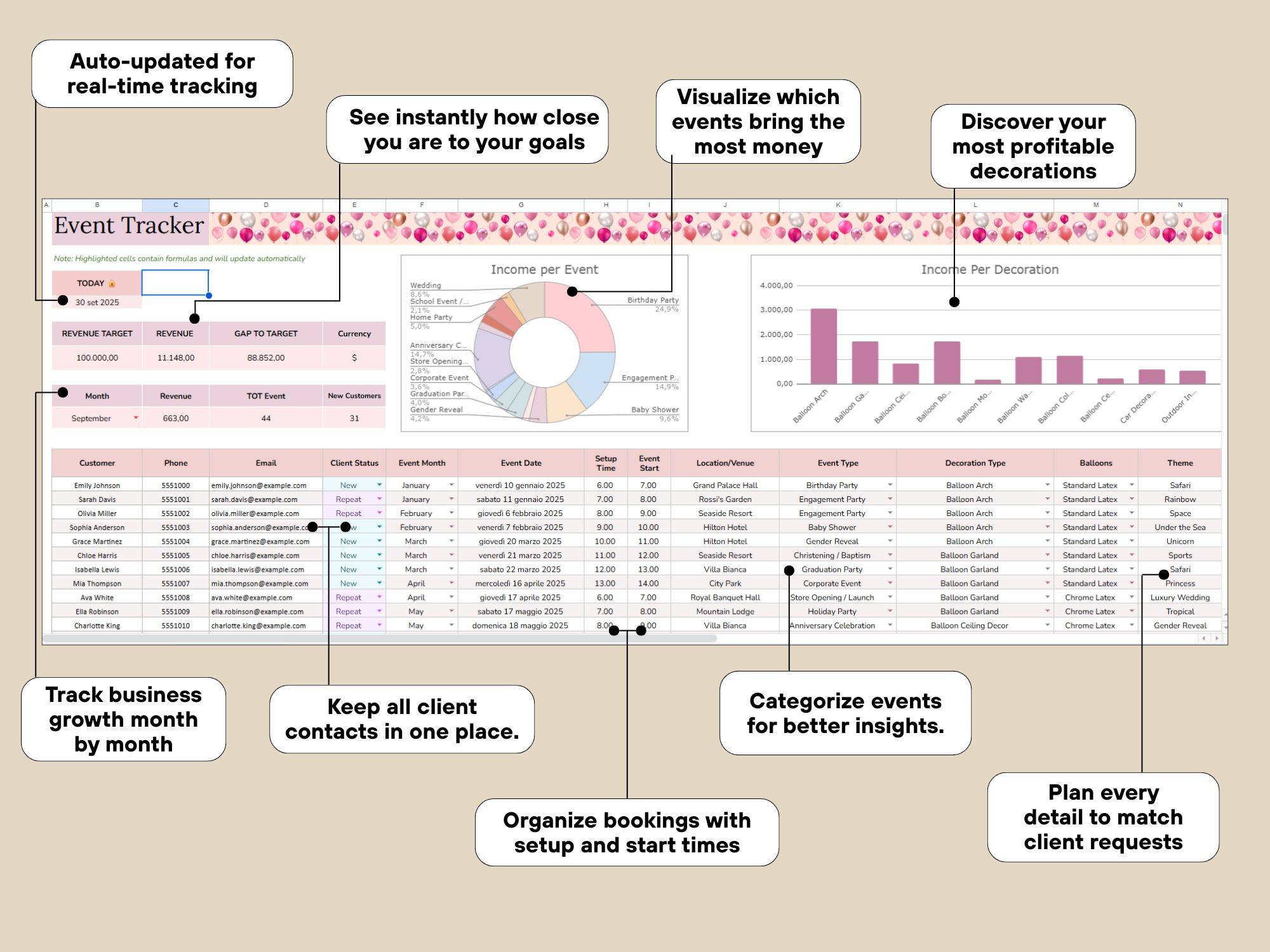 All you need is Google Sheets. Every detail is editable — from events to expenses, clients to inventory — so you can tailor the planner to your balloon business needs.”