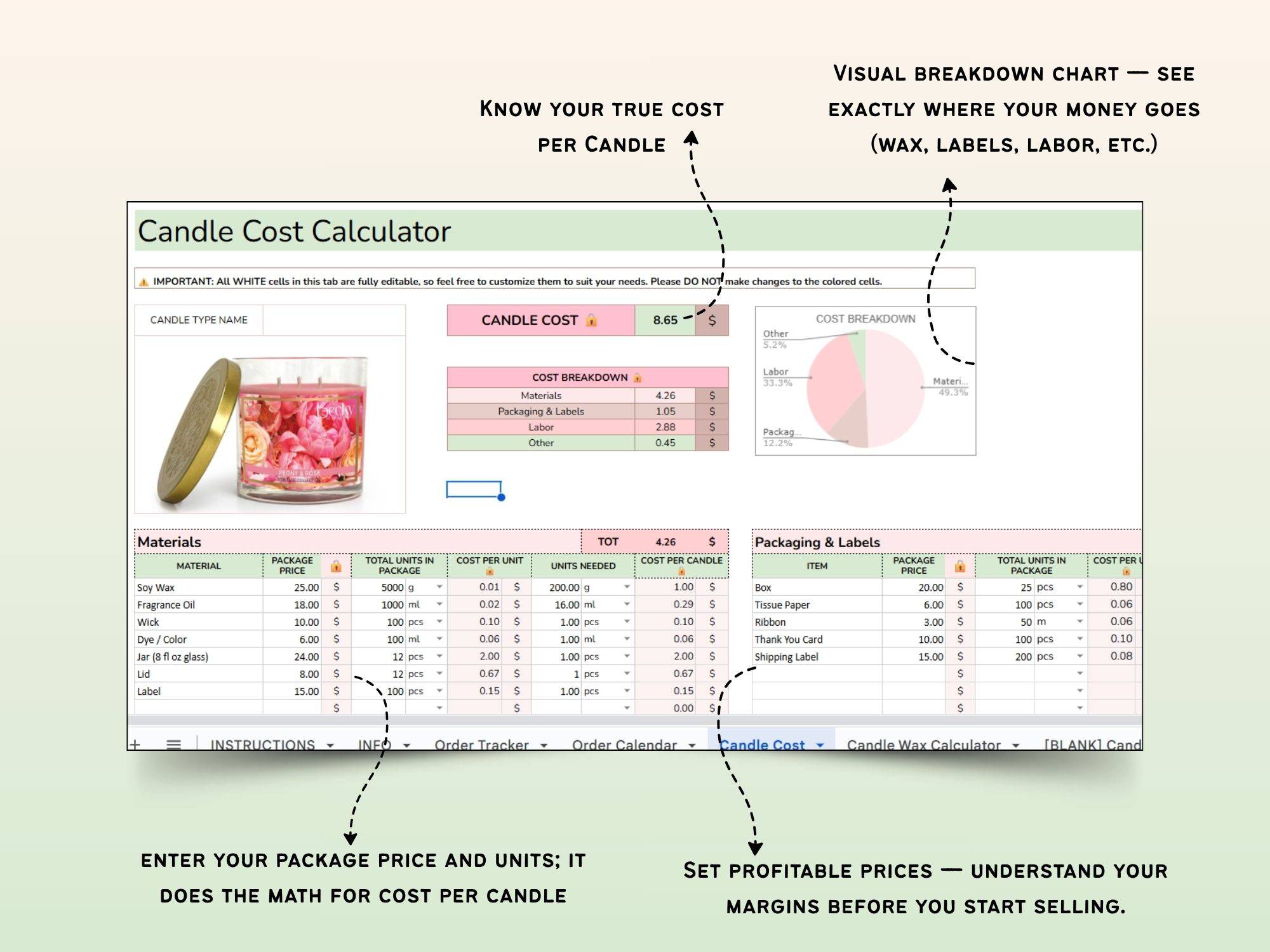 π―οΈ This simple, ready-to-use spreadsheet is every candle makerβs dream. Just download, open, and start organizing your candle business right away.Add orders, track materials, calculate candle costs β everything updates automatically, with no complicated setup required