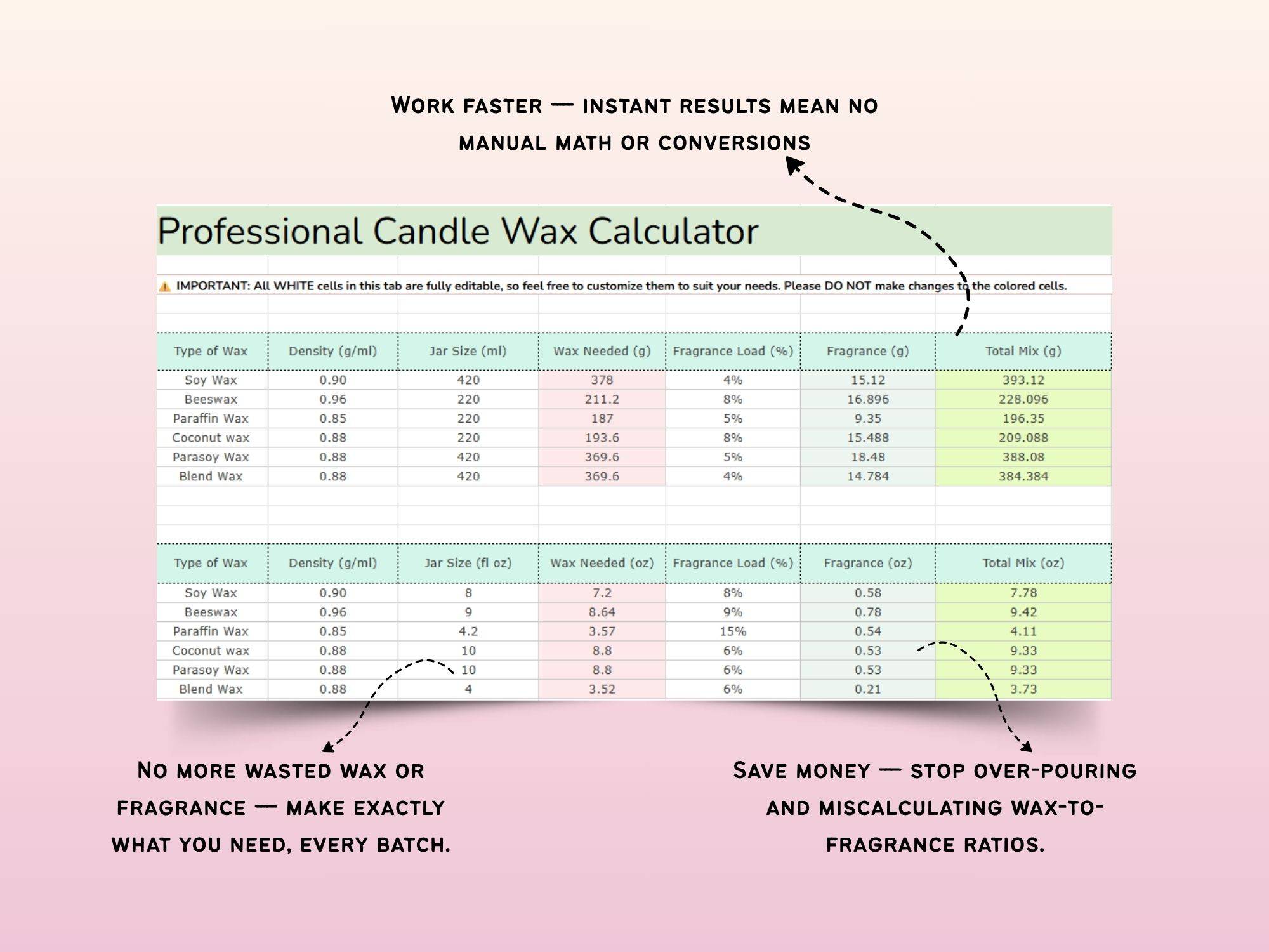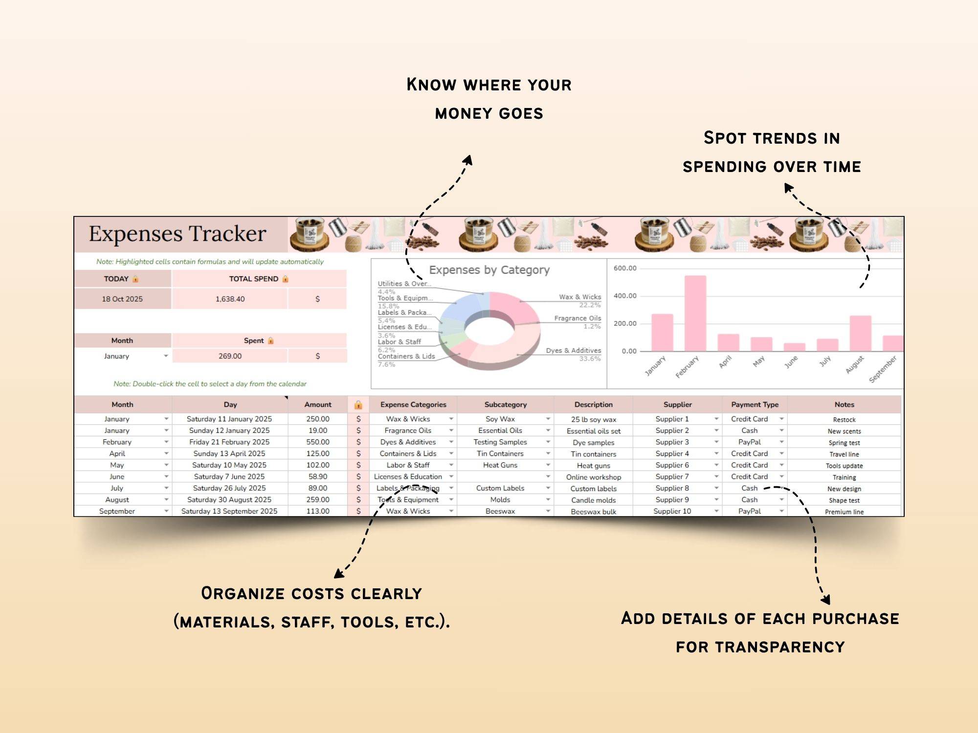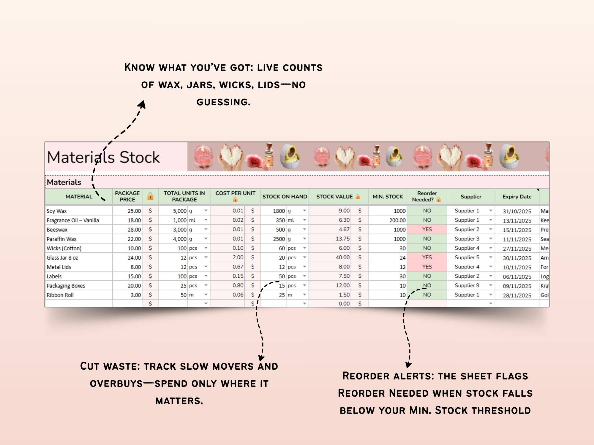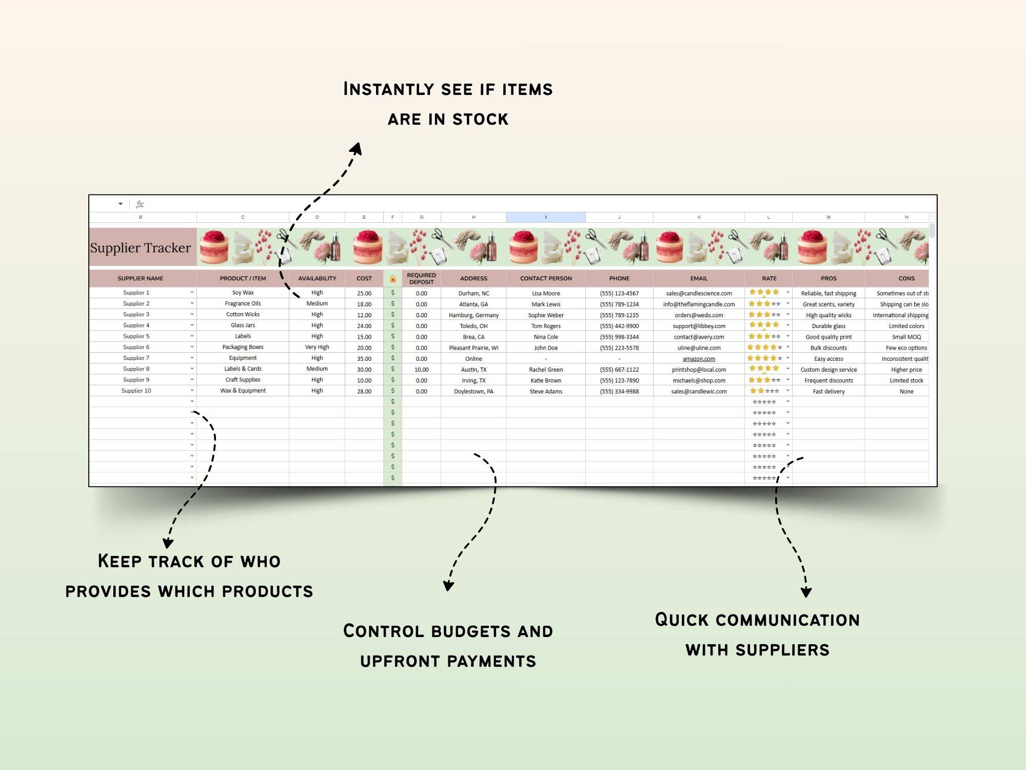 All you need is Google Sheets β every detail is fully editable, from wax recipes to pricing, suppliers to batches β so you can easily customize it for your candle business