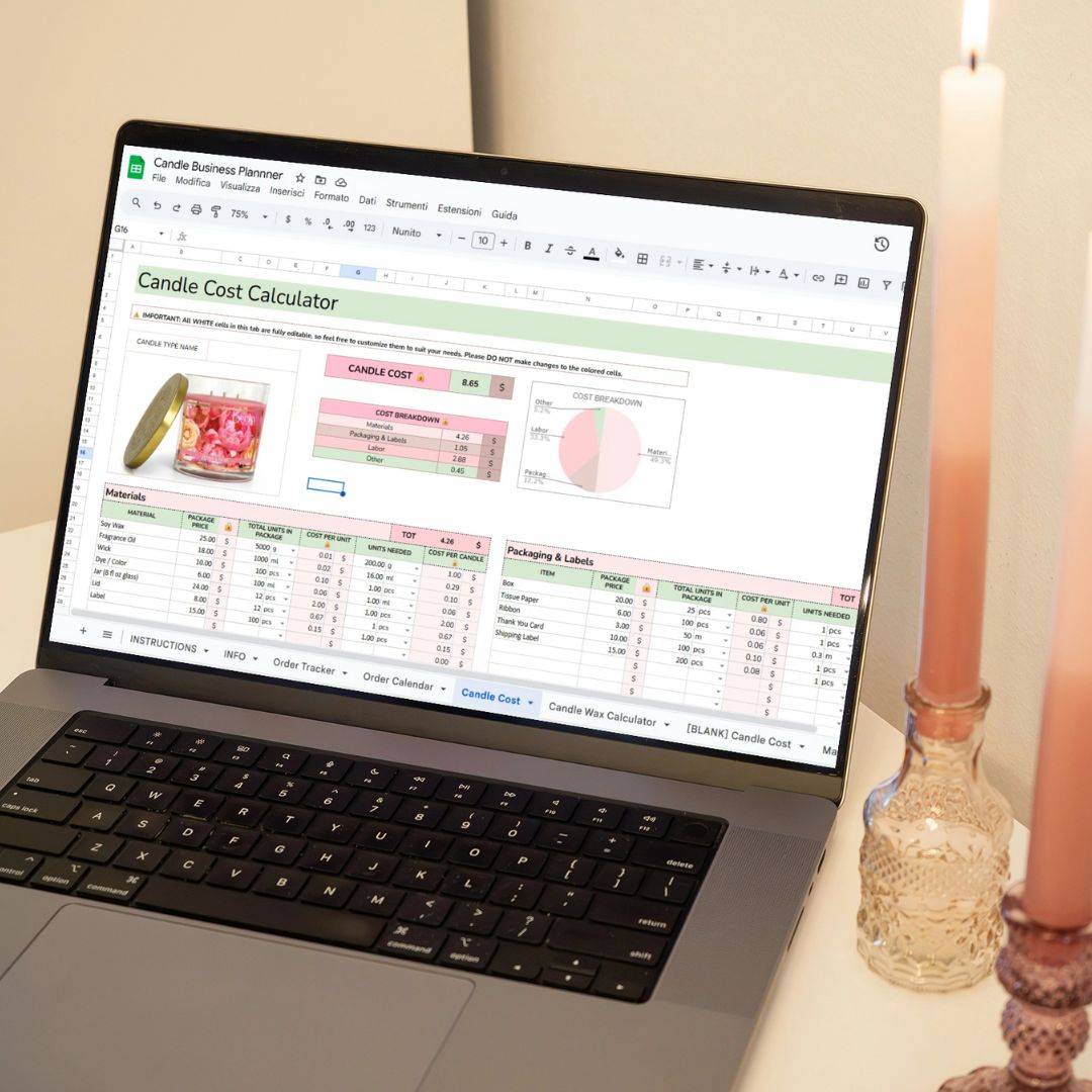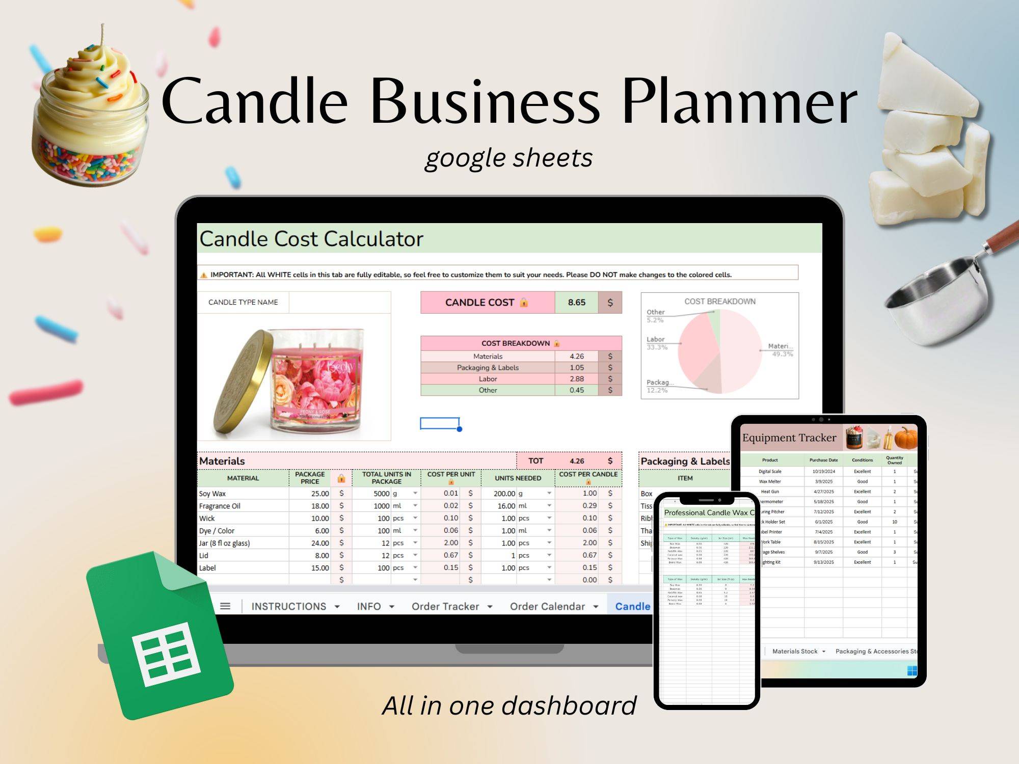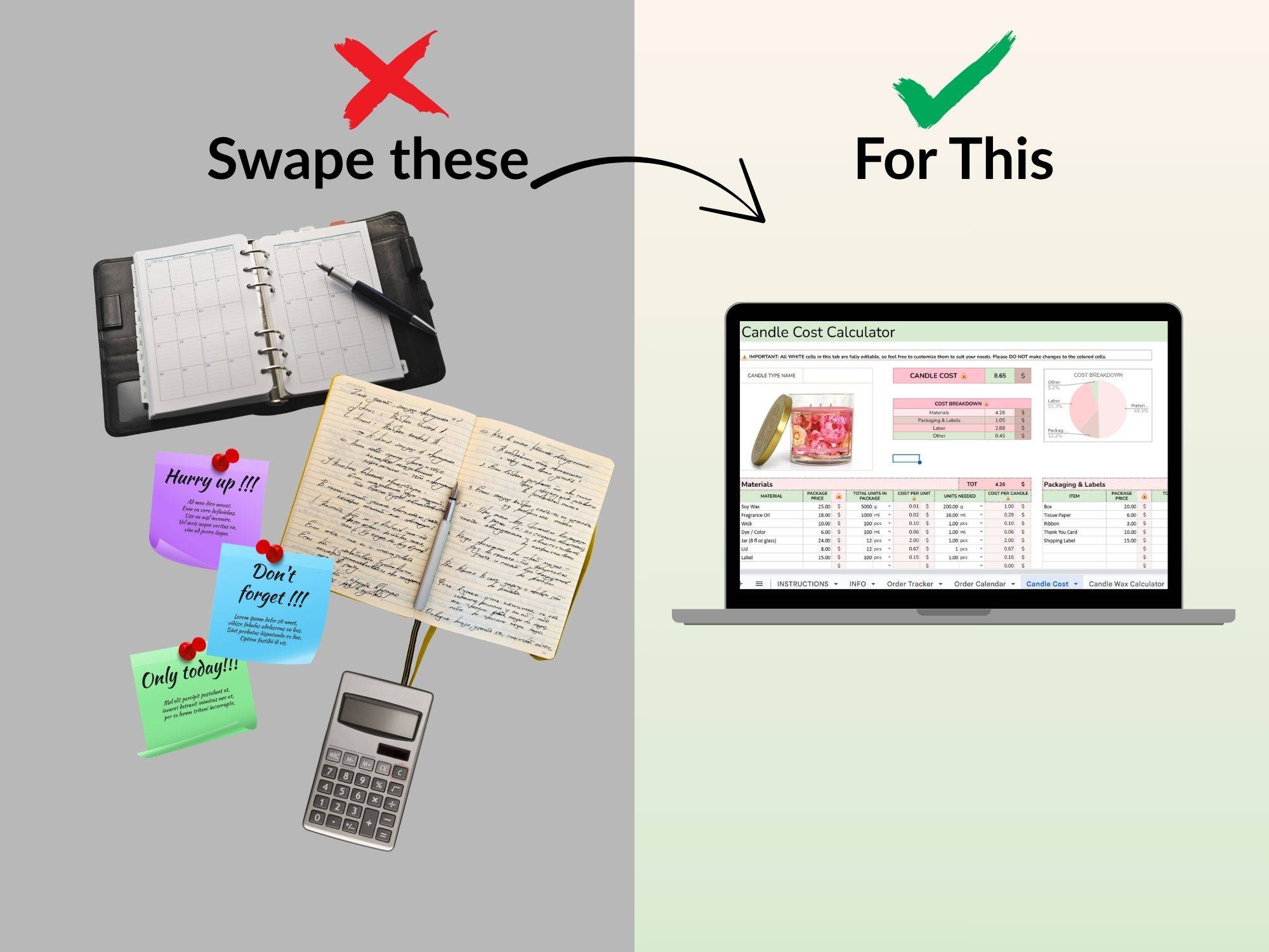 The Candle Business Planner turns all those messy spreadsheets and notes into one smart, connected system that does the hard work for you.