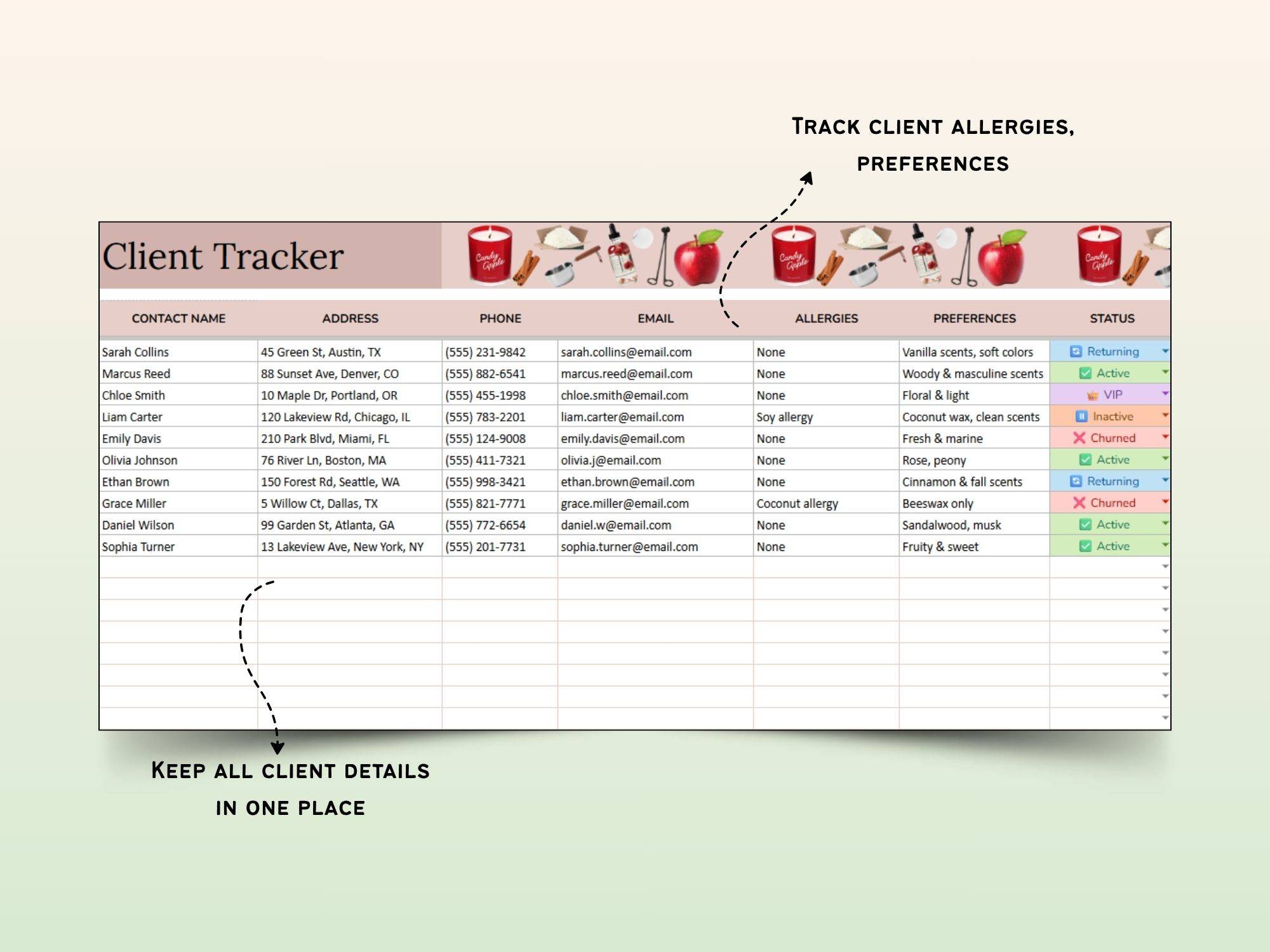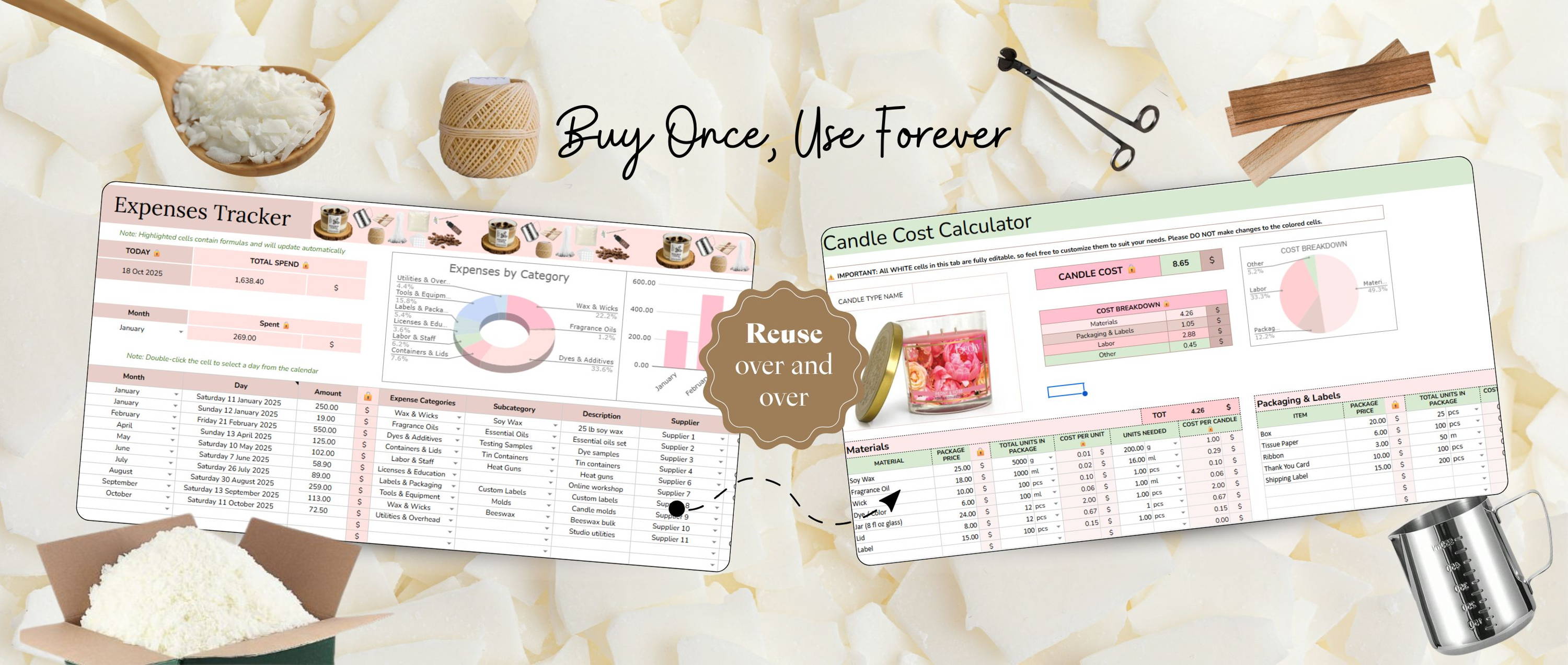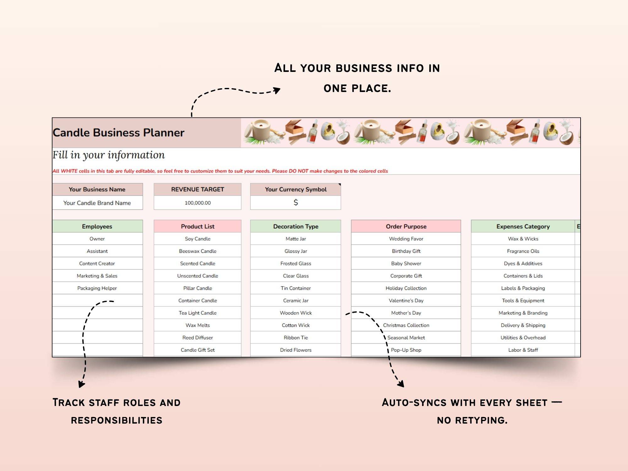 The Candle Business Planner turns all those messy spreadsheets and notes into one smart, connected system that does the hard work for you.