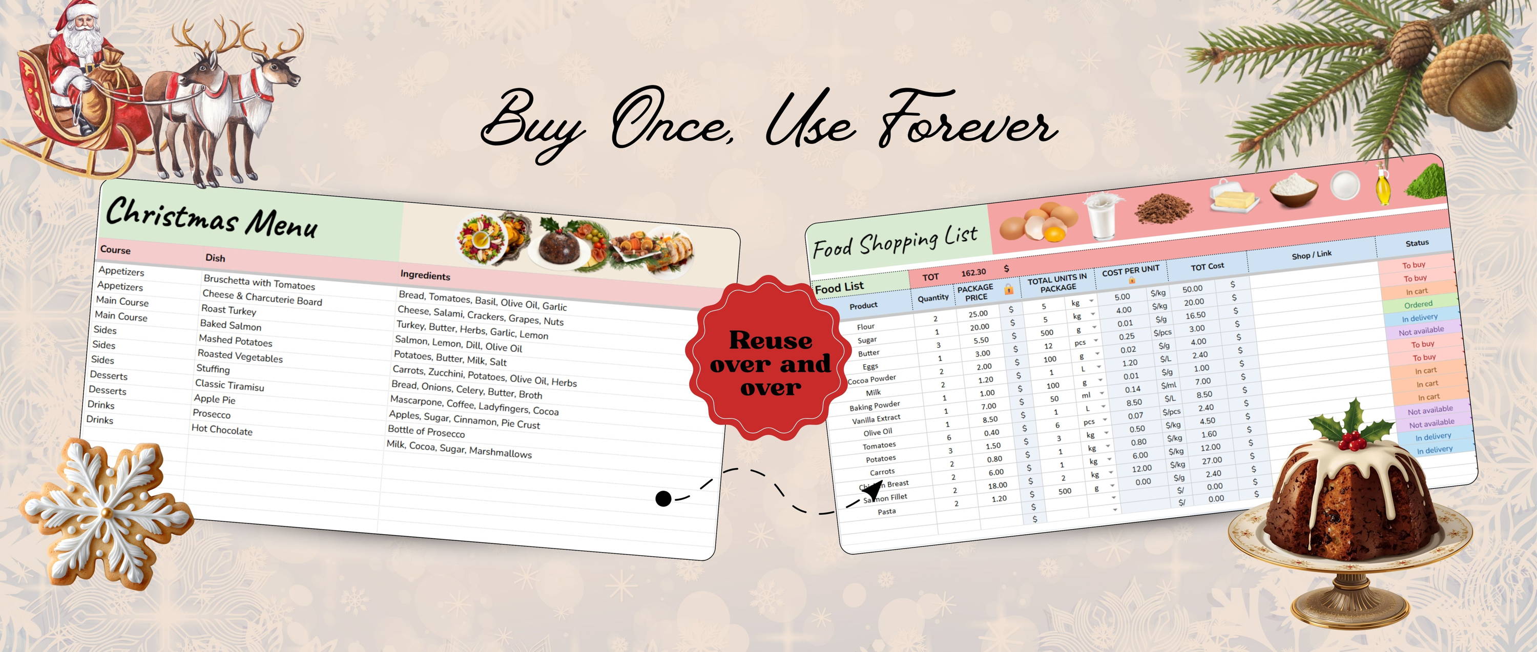 All you need is Google Sheets β every section is fully editable, from gift budgets to menus, events, decorations, and shopping lists β so you can tailor it perfectly to your holiday plans.