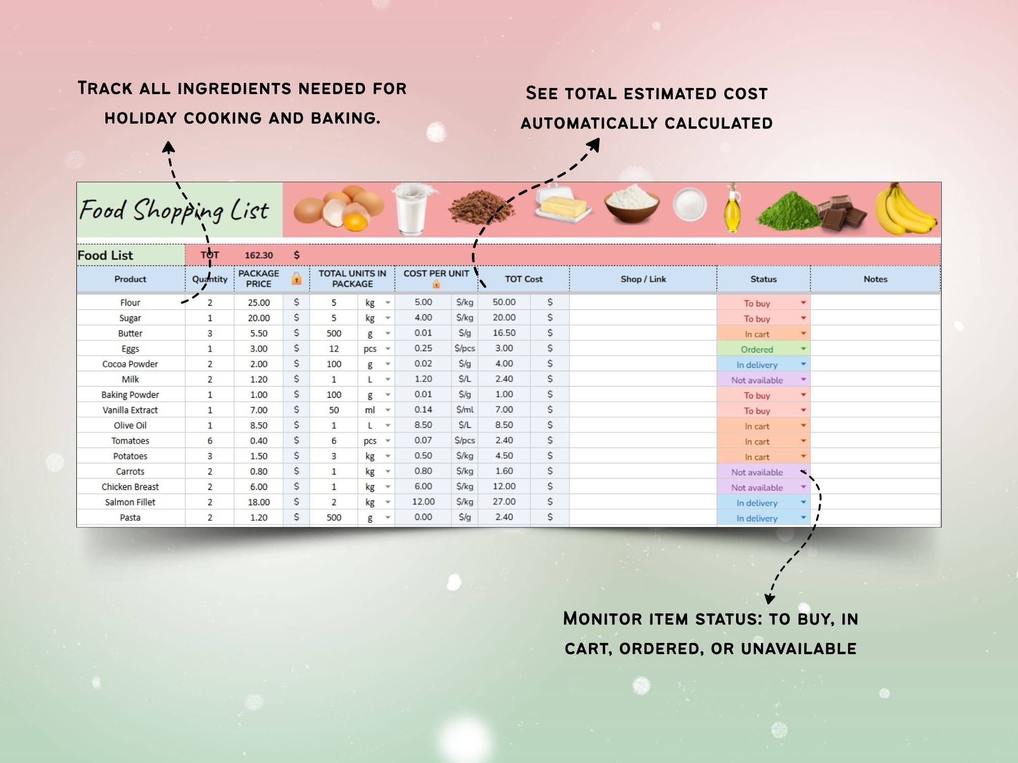 π A complete shopping & supply log so you never lose track of ingredients, gifts, links, budgets, or what still needs to be ordered.