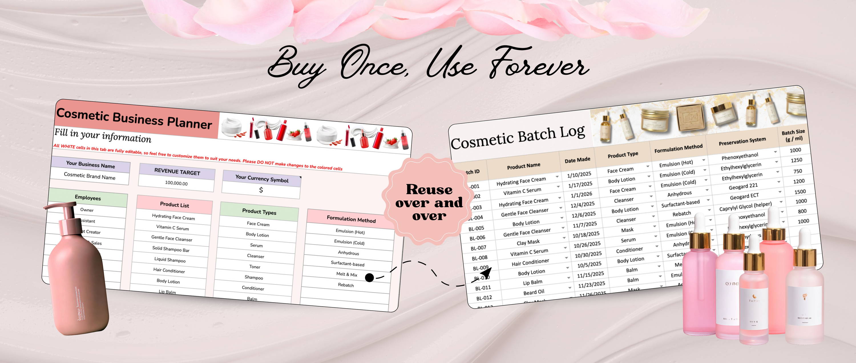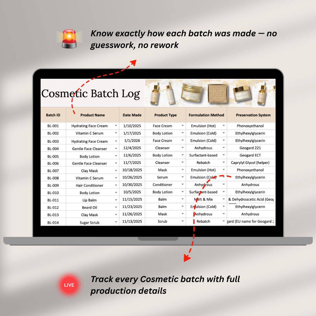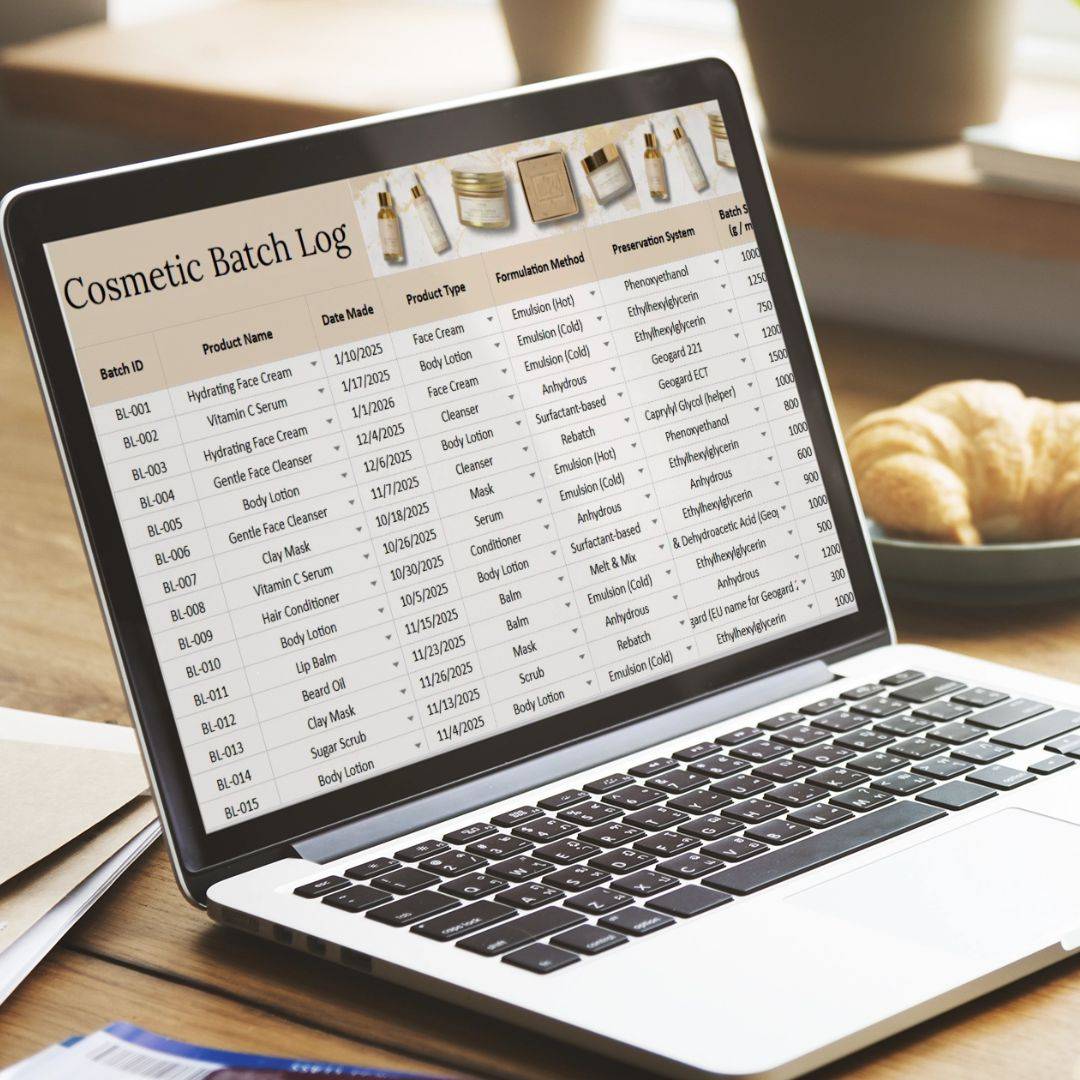 This simple, ready-to-use spreadsheet is every handmade cosmetic maker’s dream. Just download, open, and start managing your cosmetic business right away. Add formulas and recipes, track batches and inventory, calculate real production costs and pricing — everything updates automatically, with no complicated setup required.