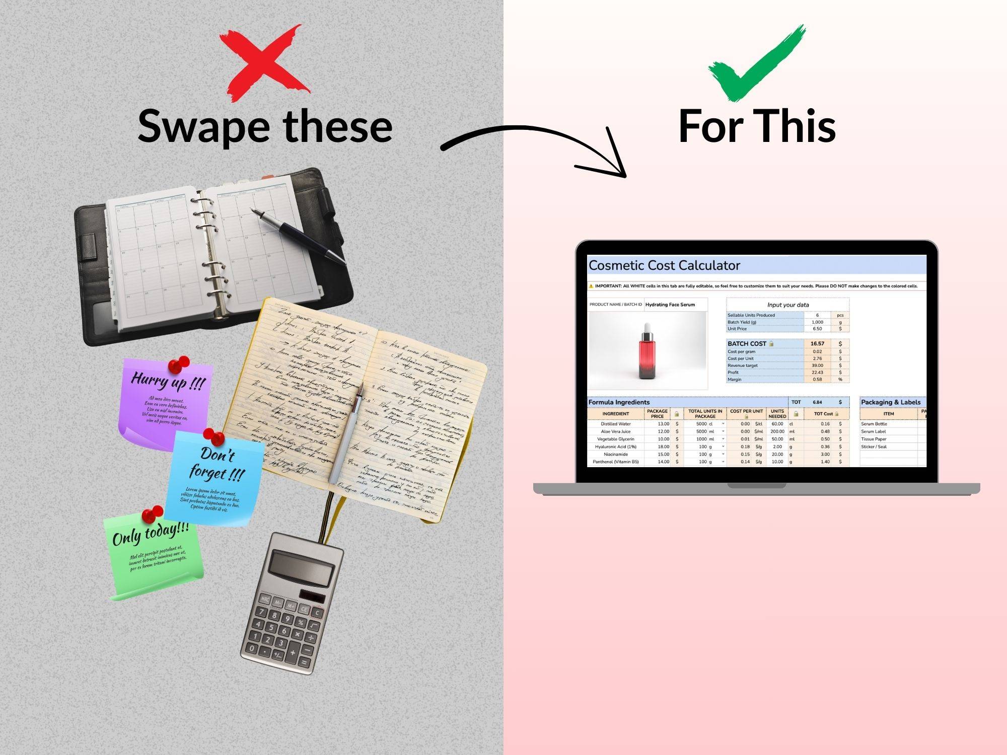 The Cosmetic Business Planner turns scattered spreadsheets and notes into one smart, connected system that tracks every detail for you — from recipes and batches to expenses and margins.