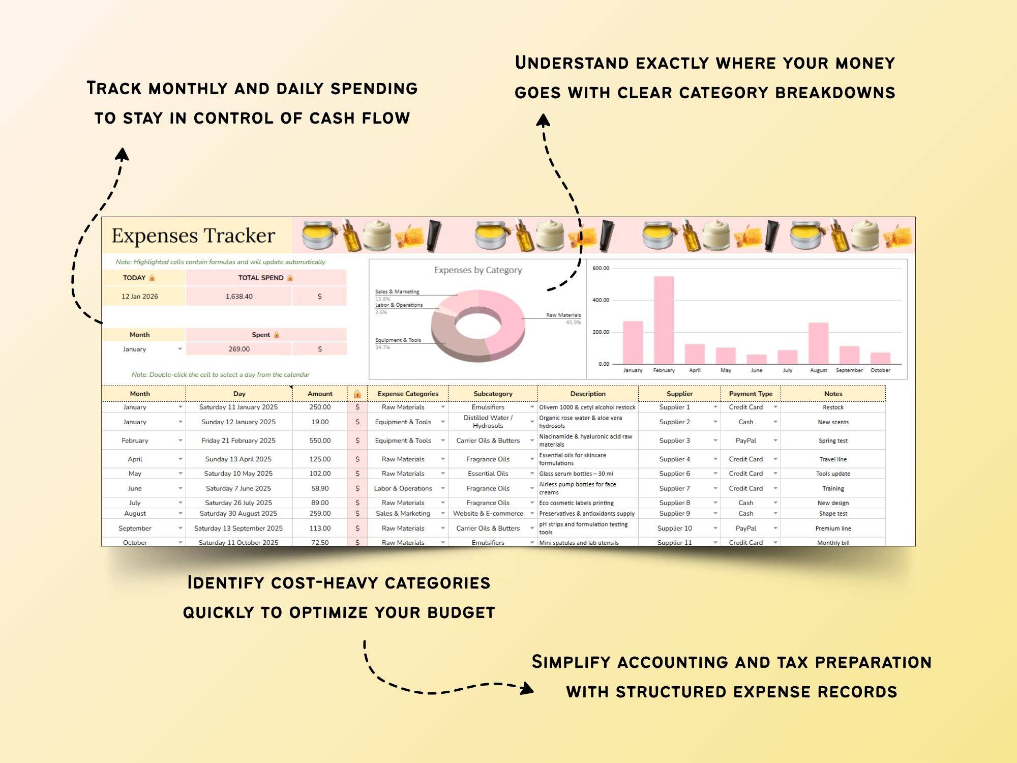 📊 An expense tracker that shows exactly where your money goes — from ingredients and lab tools to packaging, shipping, and marketing.