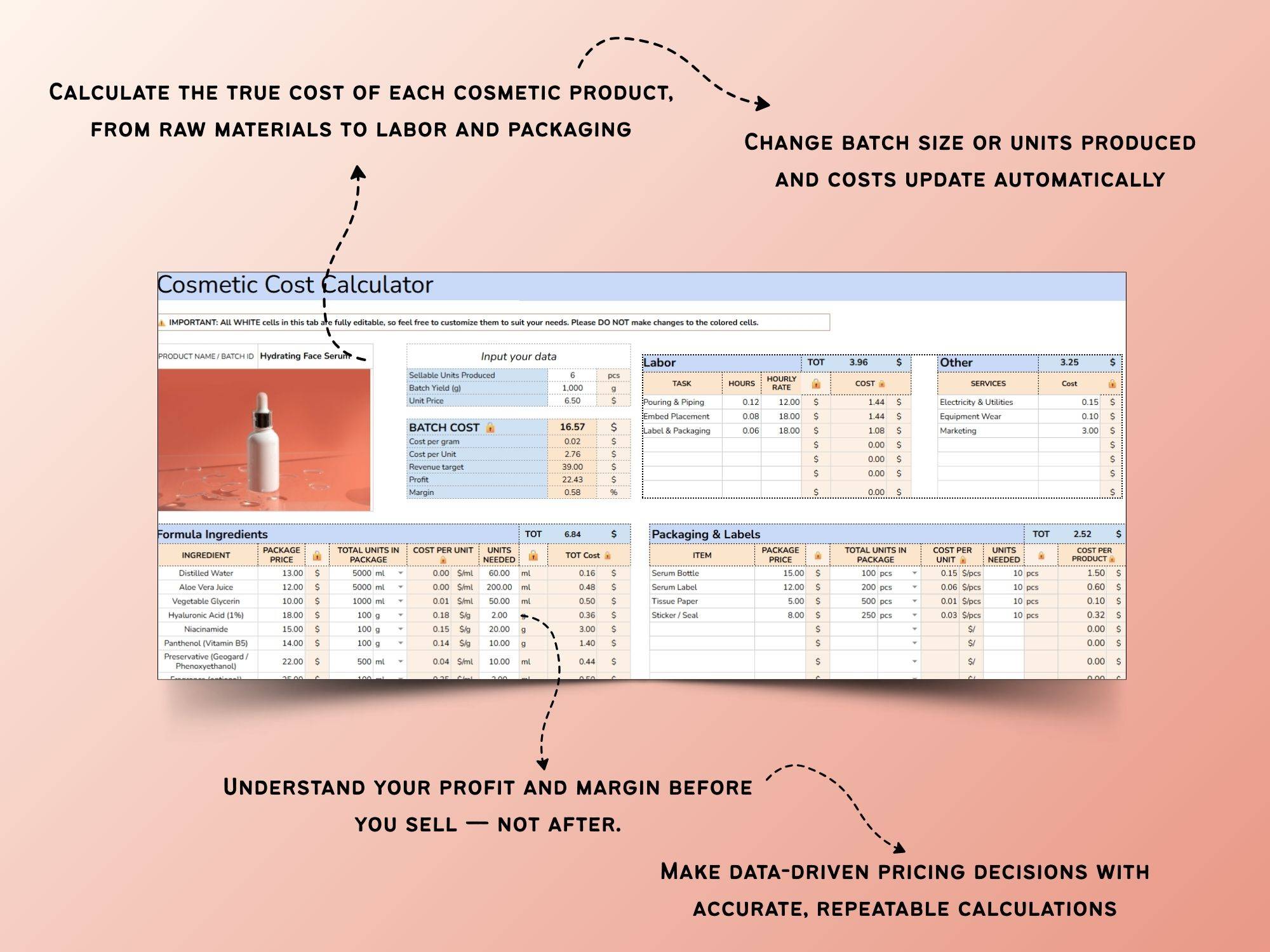 Built in Google Sheets, every cell is editable — from cosmetic formulas and batch costs to supplier pricing, inventory, packaging, and profit margins — so you can easily tailor it to your handmade cosmetic brand, whether you sell skincare, haircare, online, at markets, or wholesale.