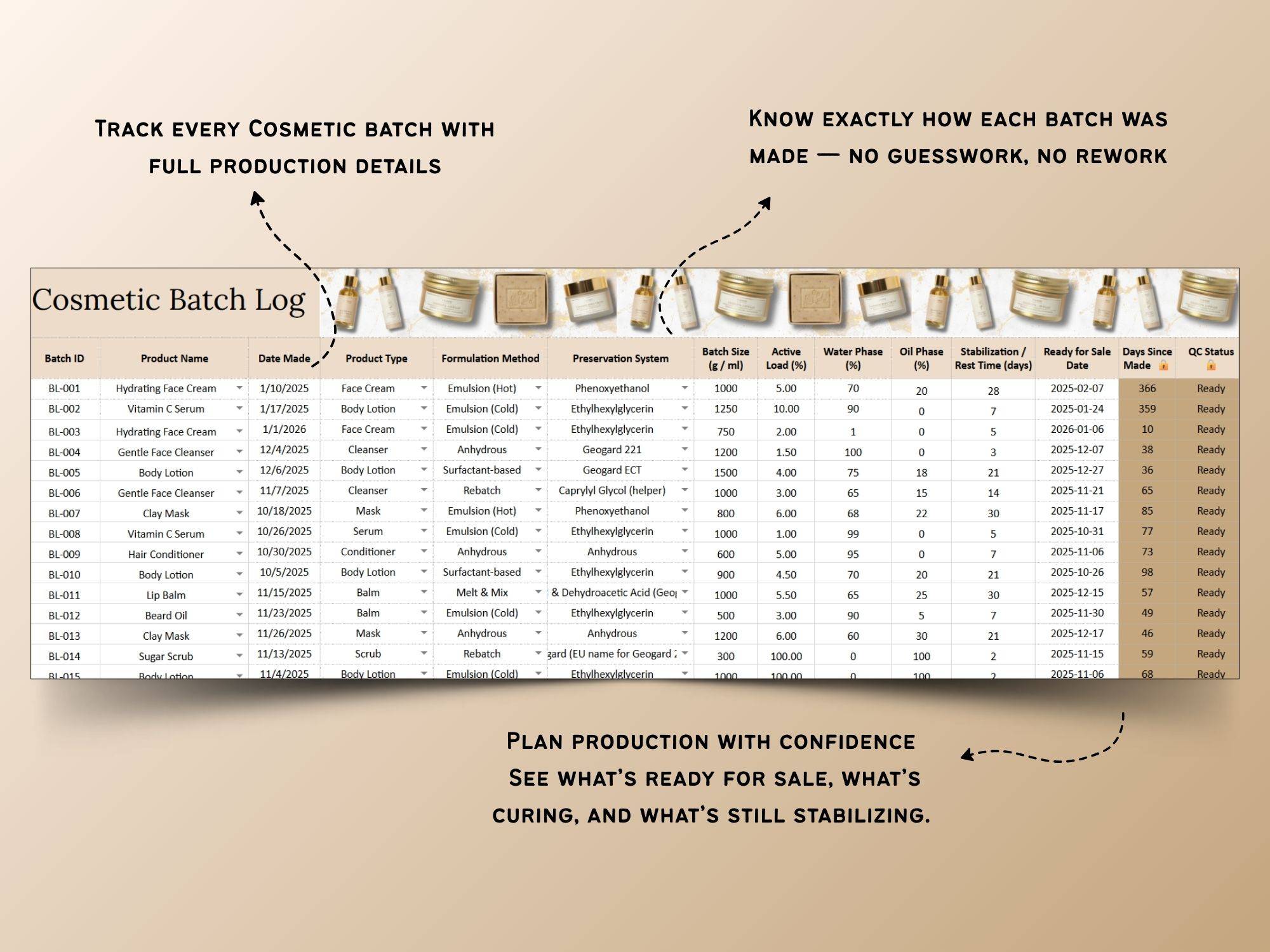 🧴 Clear batch & production tracking so you always know what’s in testing, what’s curing or stabilizing, and what’s ready for sale.