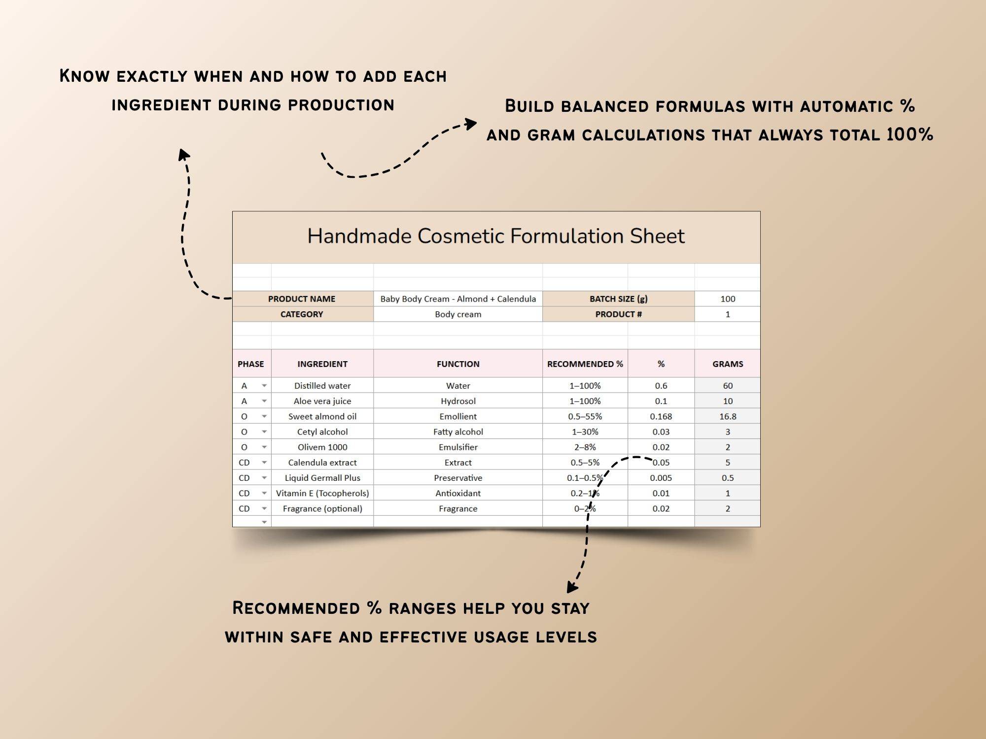 Automated formula calculations, batch sizing, cost tracking, and inventory management — all in one easy-to-use Google Sheet designed for handmade cosmetic businesses.