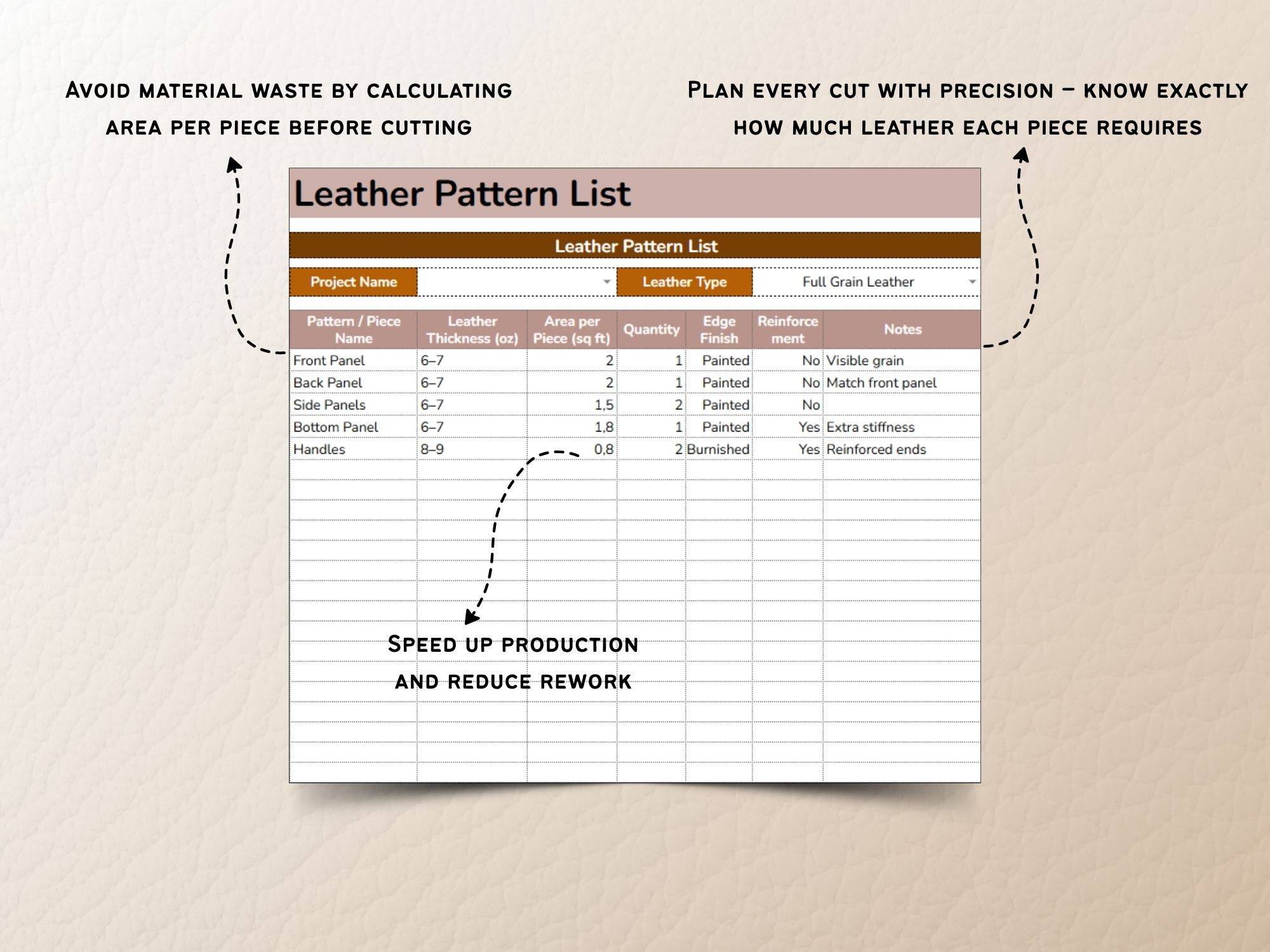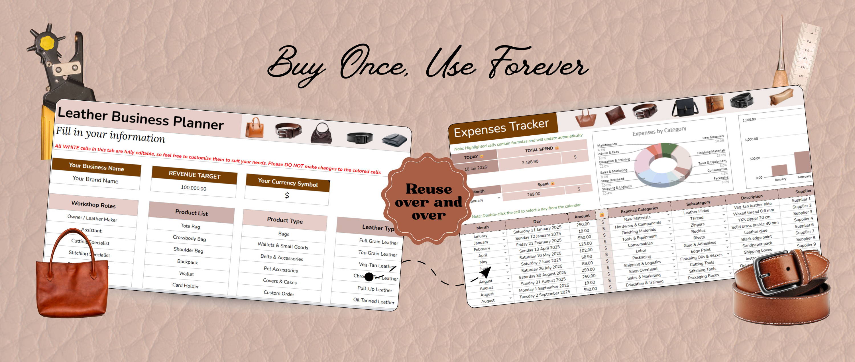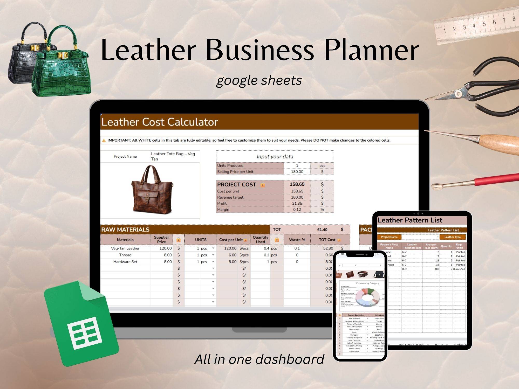 All you need is Google Sheets β every section is fully editable, from leather patterns and material usage to project costing, pricing, hardware, tools, suppliers, and orders, so you can tailor the planner perfectly to your leather business, whether you create custom bags, wallets, accessories, or small-batch leather goods.