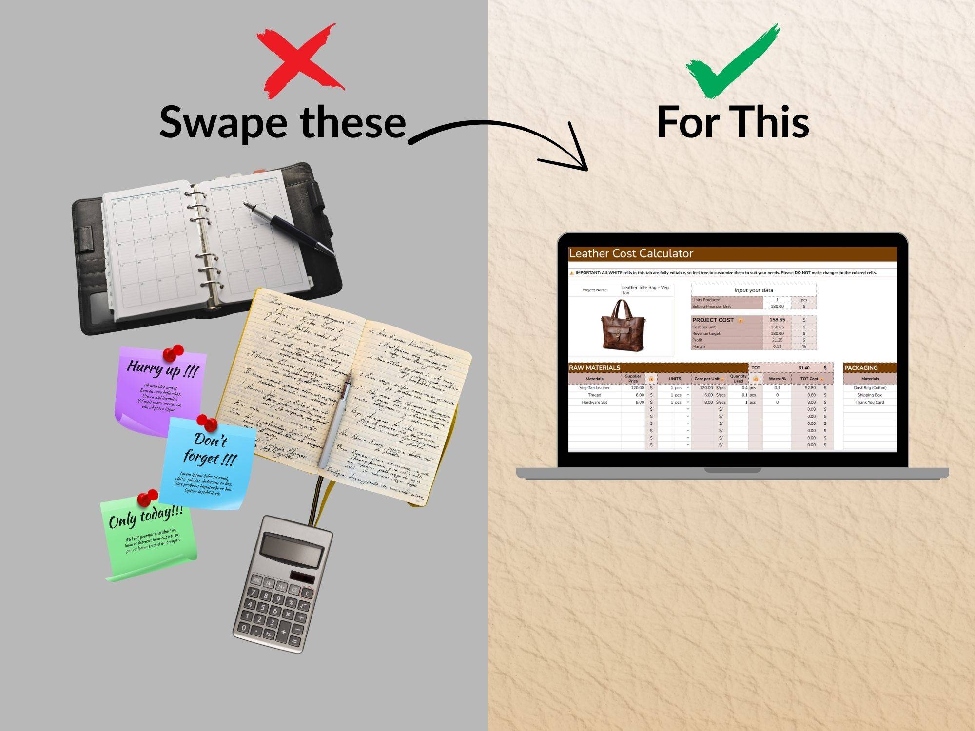 The Leather Business Planner turns scattered spreadsheets and notes into one smart, connected Google Sheets system that keeps your entire leather workshop organized and under control.