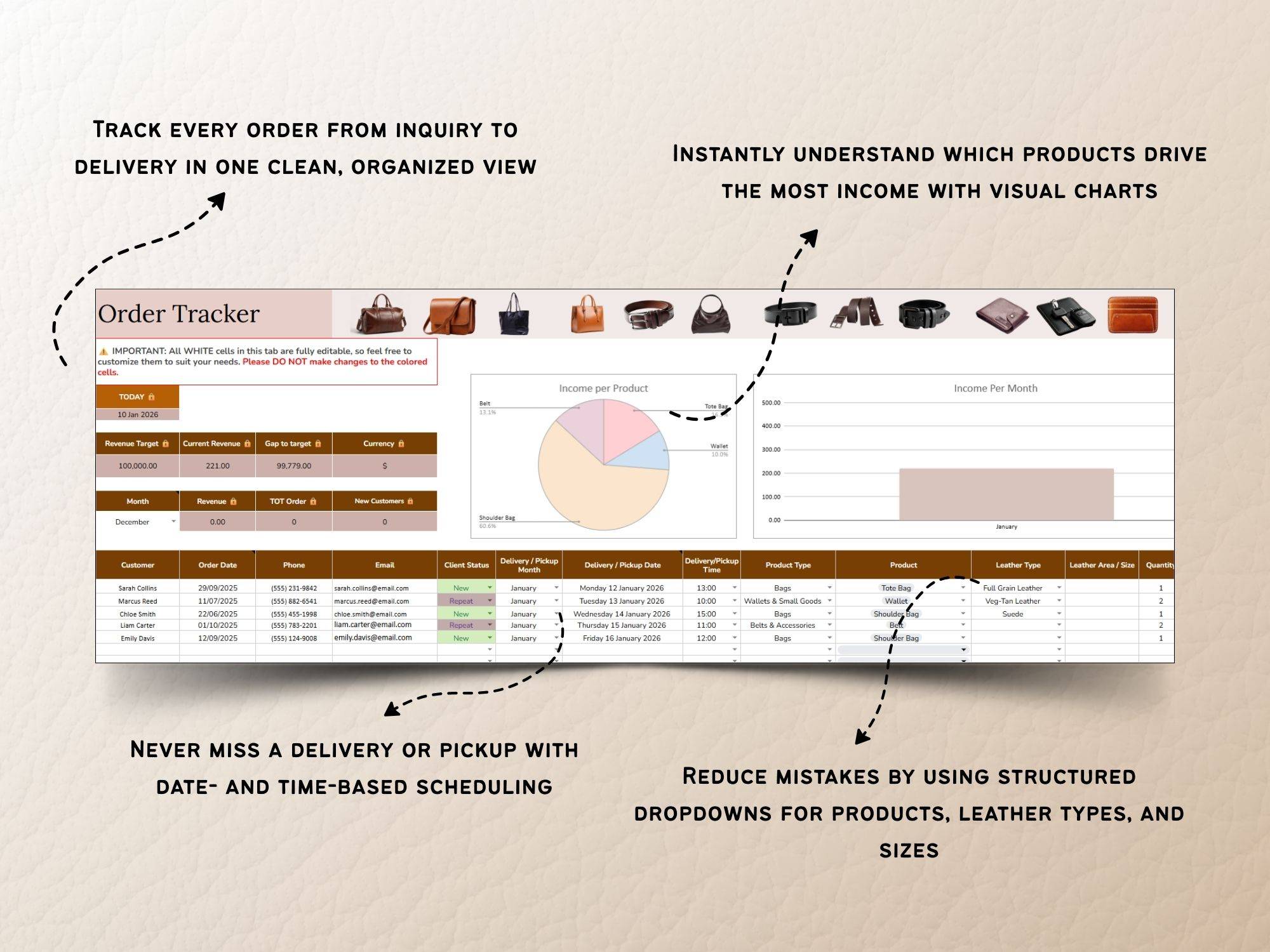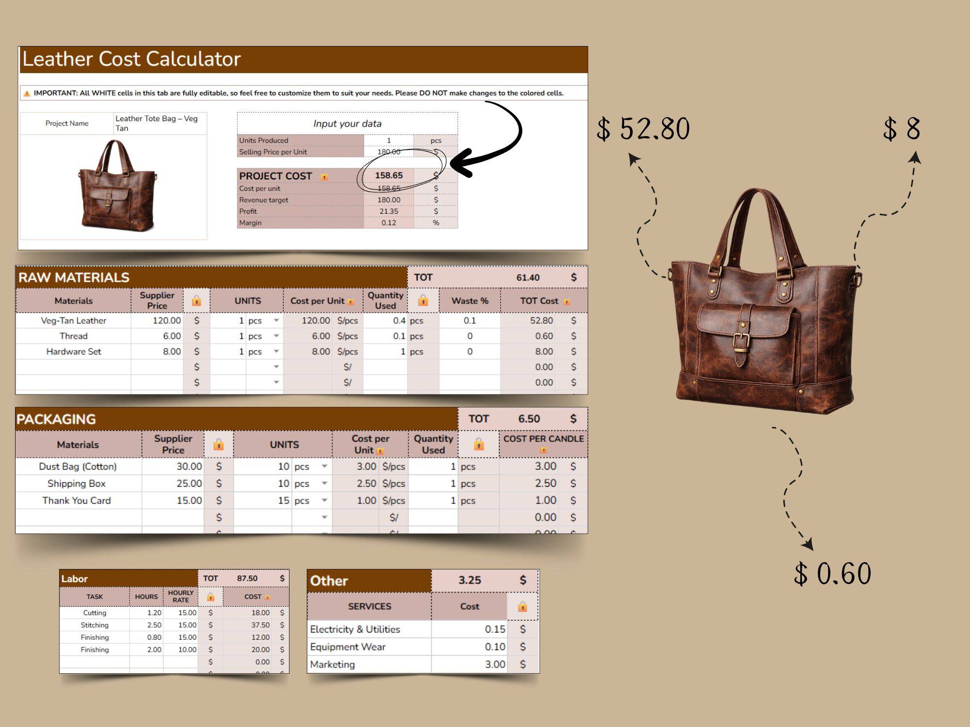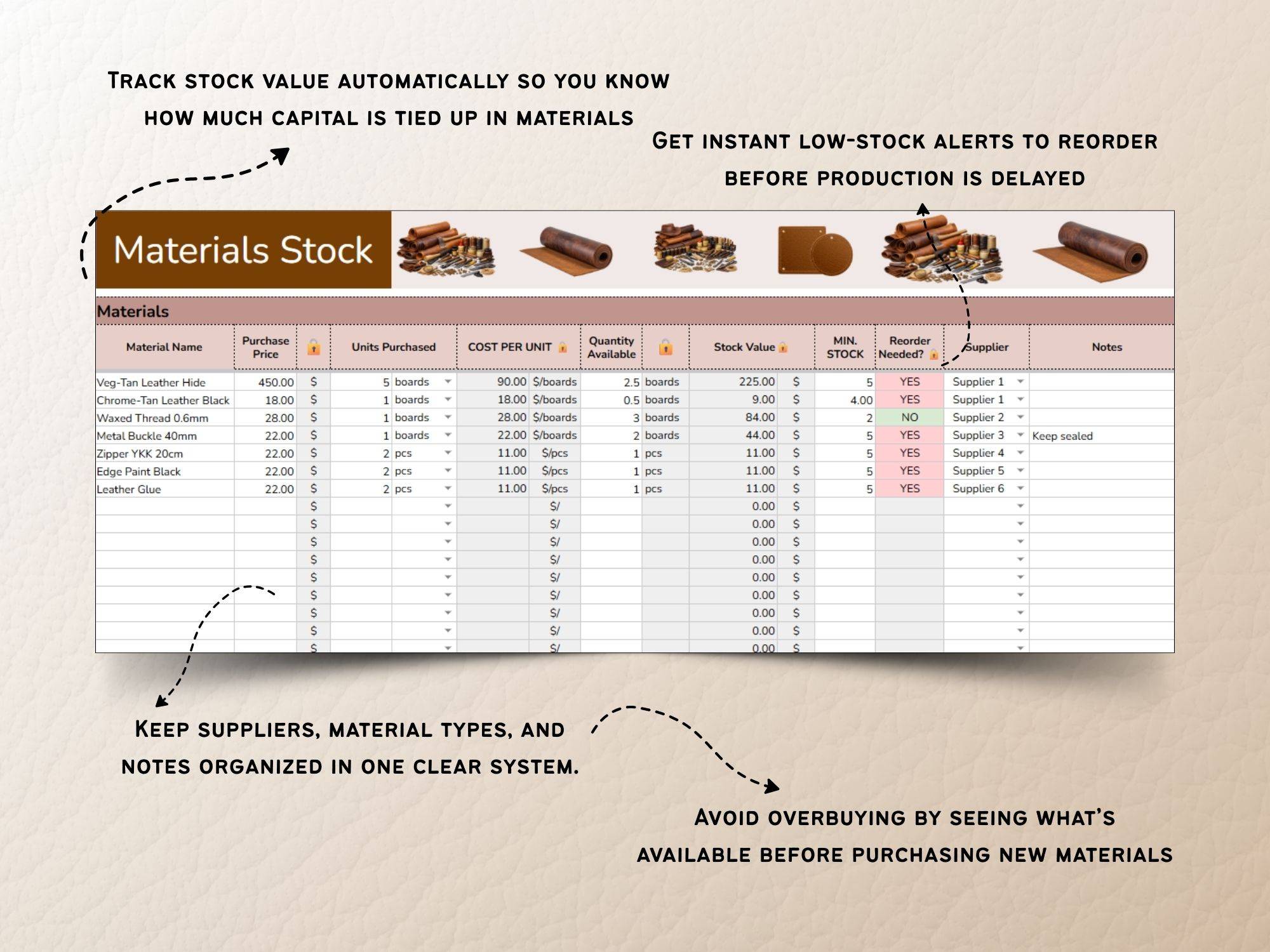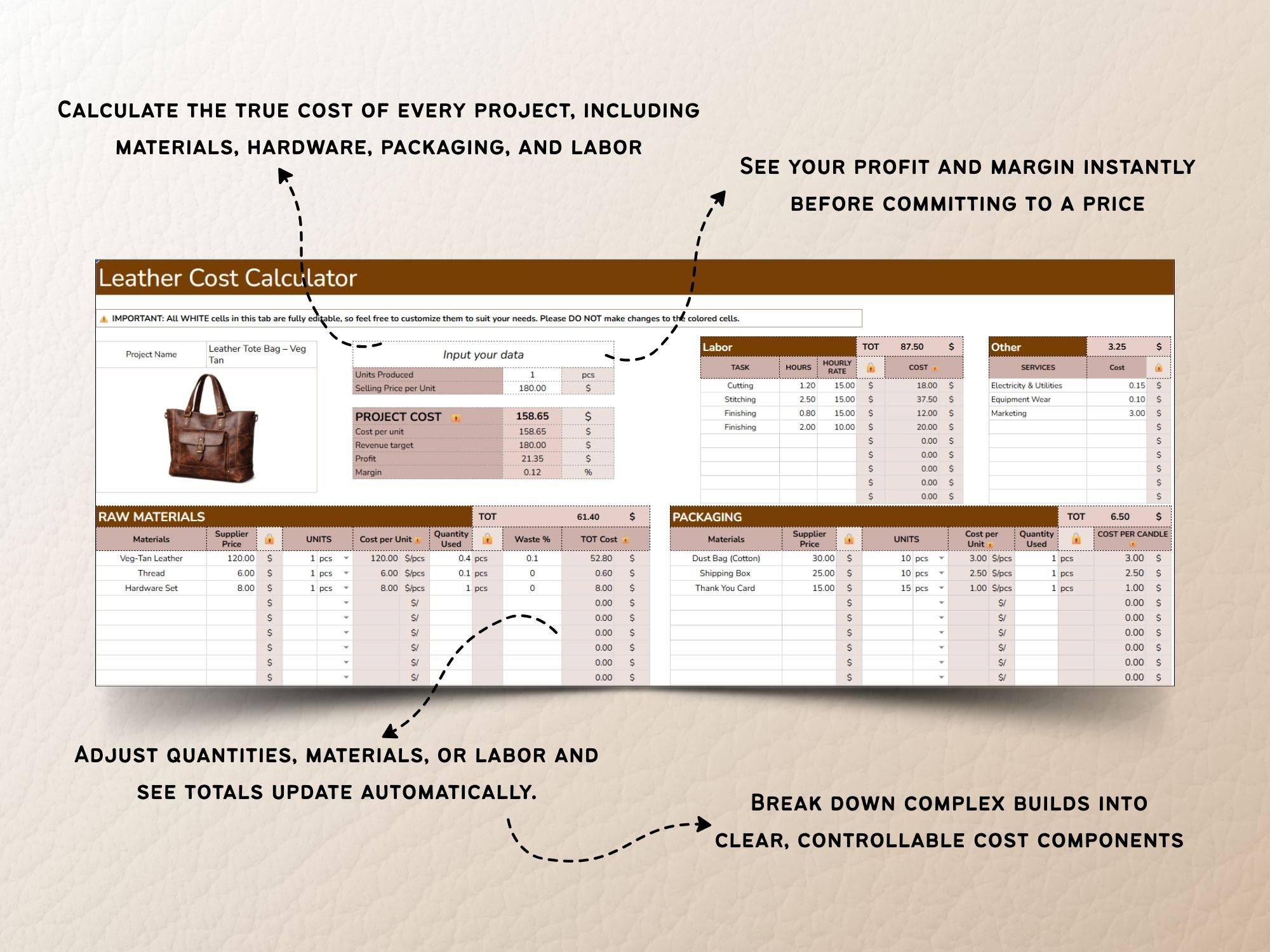 Built for leather makers, not accountants. All formulas are ready β just enter your project details and watch everything update automatically across materials, costs, pricing, production schedules, and orders.