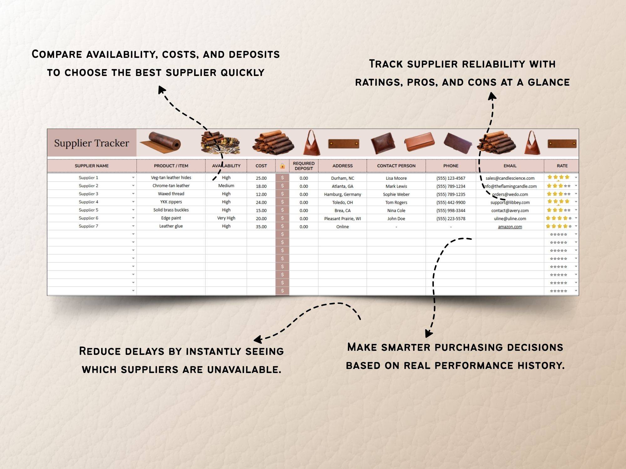 - Step 2: CustomizeOrganize everything β leather projects, patterns, materials, hides, hardware, suppliers, labor, pricing, and production timelines β all in one connected Google Sheet.