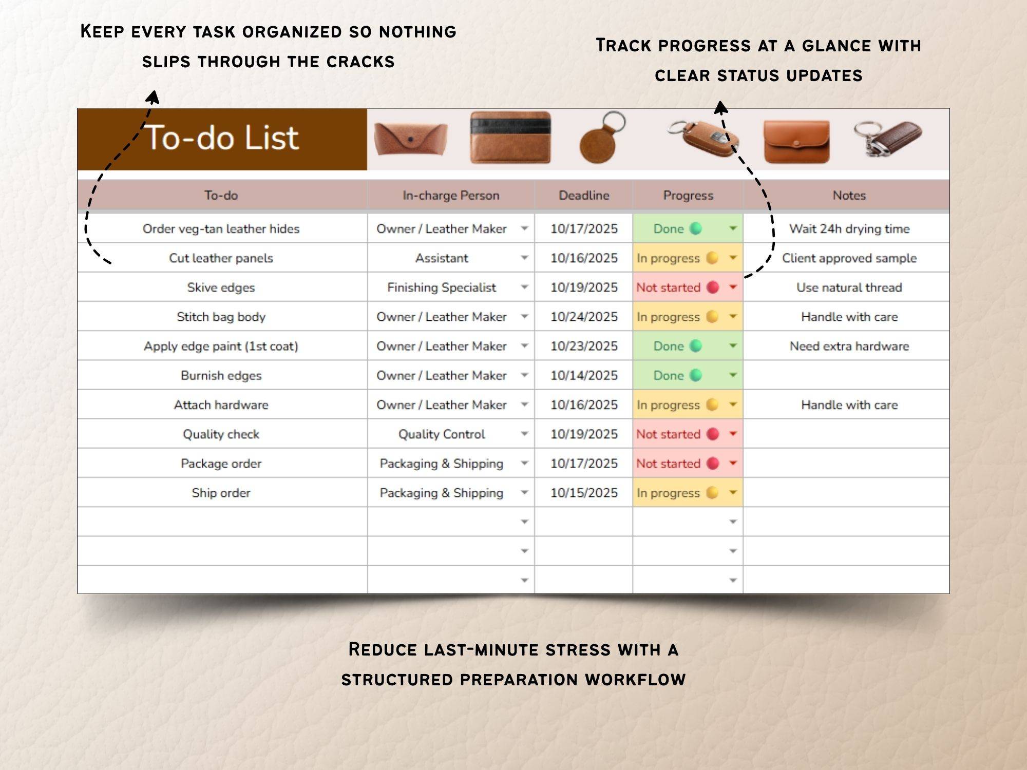 π This simple, ready-to-use spreadsheet is every leather makerβs dream. Just download, open, and start organizing your leather business right away. Track projects, manage leather and hardware, calculate real production costs, control inventory, and monitor expenses β everything updates automatically, with no complicated setup required.